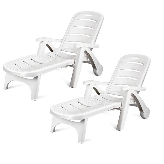 Giantex Folding Lounger Chaise Chair on Wheels Outdoor Patio Deck Chair Adjustable Rolling Lounger 5 Position Recliner w/Armrests (2, White)