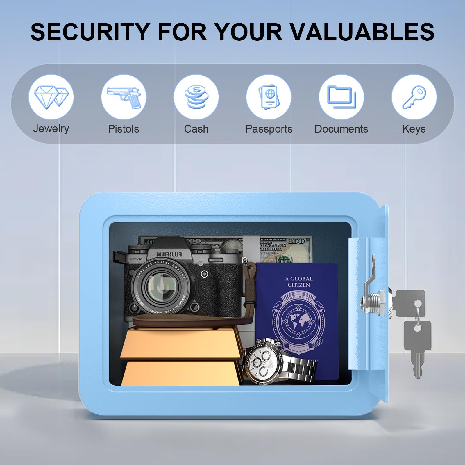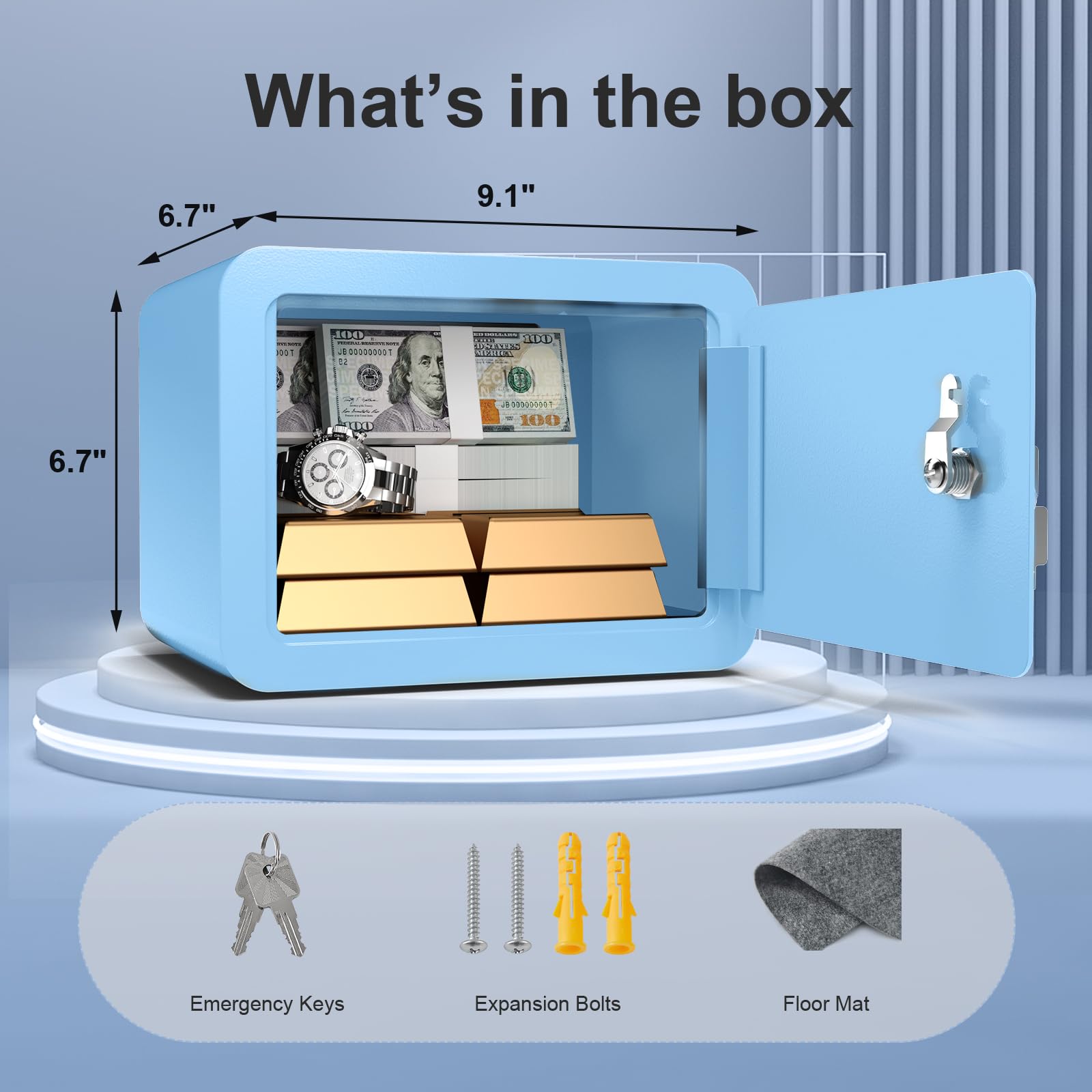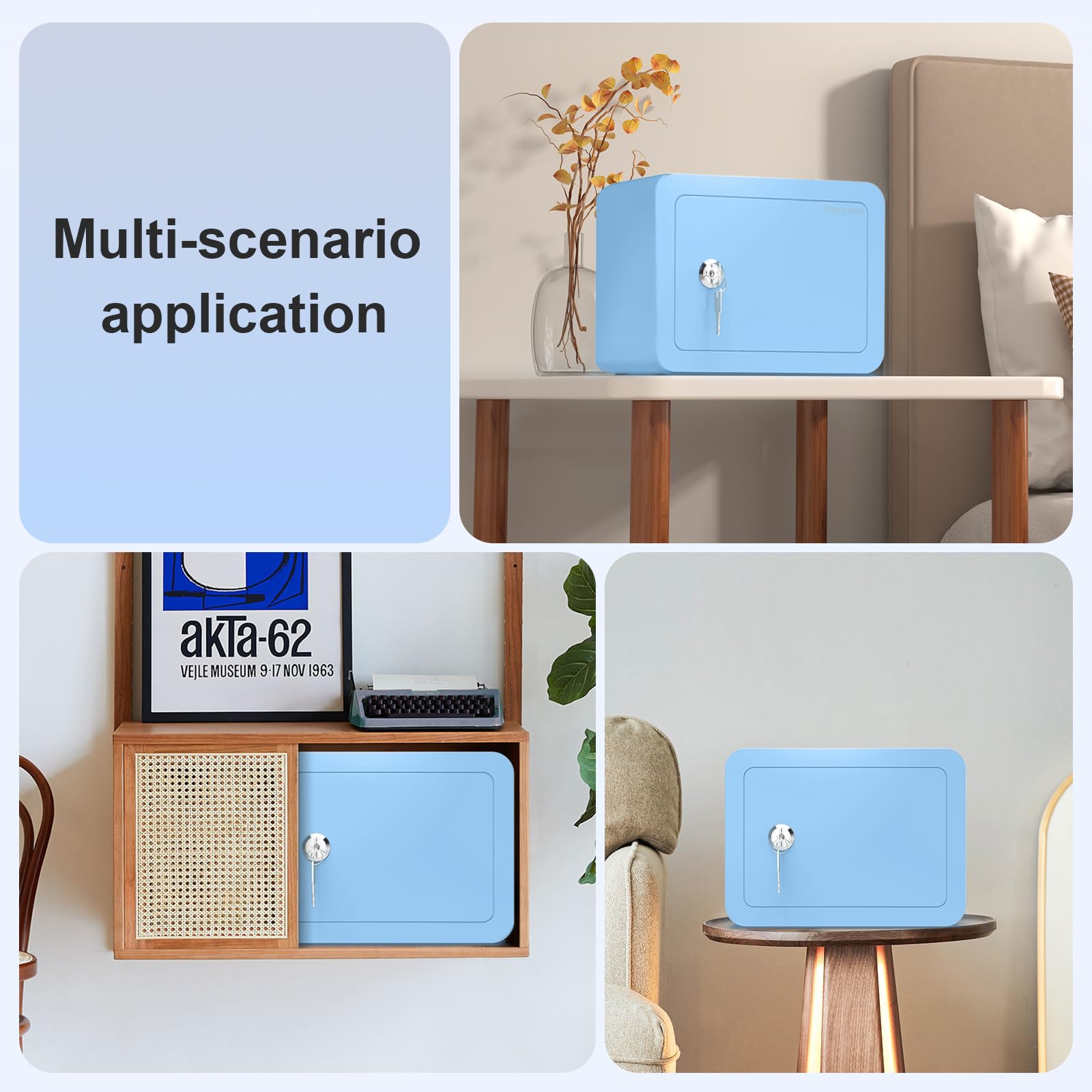 0.23 Cub Safe, Mini Home Safes for Money,Small Safe Box with Key, Coin and Cash, Security Safes for Kids, Lock Box for Personal Items with Size 6.69”Dx 9.06”Wx 6.69”H (Blue)