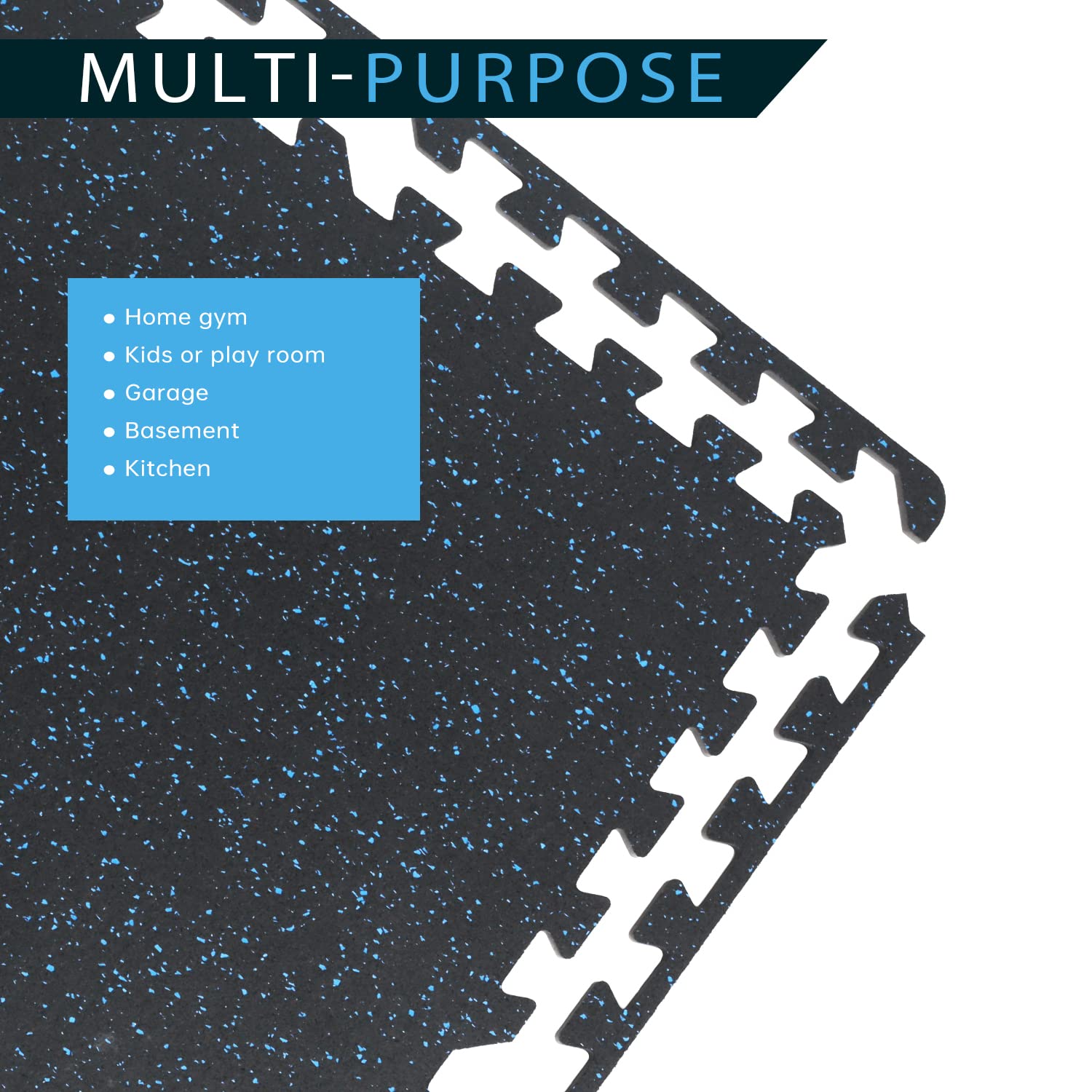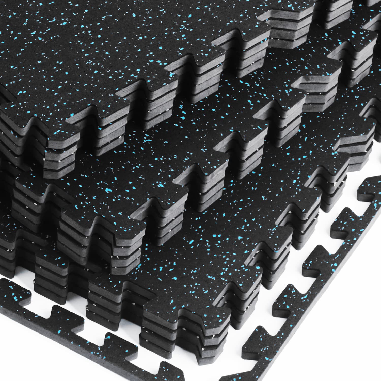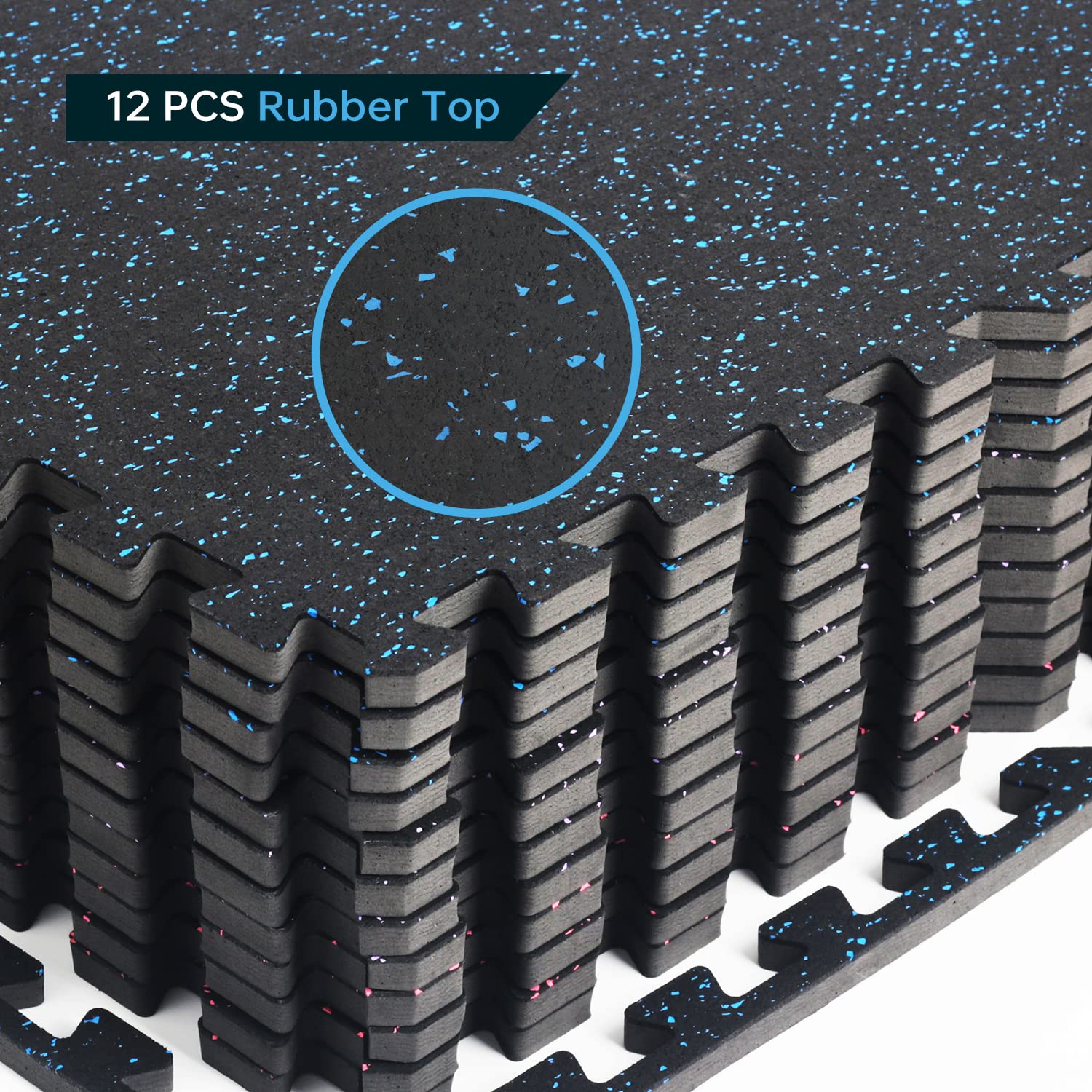 0.56 Inch Thick Gym Flooring for Home Gym with Rubber Top - 48 Sq Ft Interlocking Gym Floor Tiles - Workout Equipment Vibration Reduction Mats - 12 Pcs 24 x 24in Tile, Black & Blue