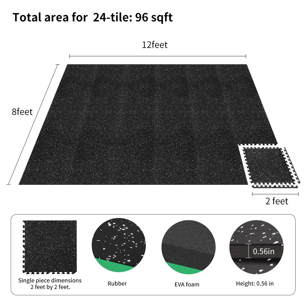 0.56in Thick 96 Sq Ft Gym Flooring for Home Gym, 24 Tiles Workout Exercise Equipment Mats, Rubber Top with EVA Foam, Interlocking Puzzle Floor Tiles for Fitness Room, Protective Flooring Mat