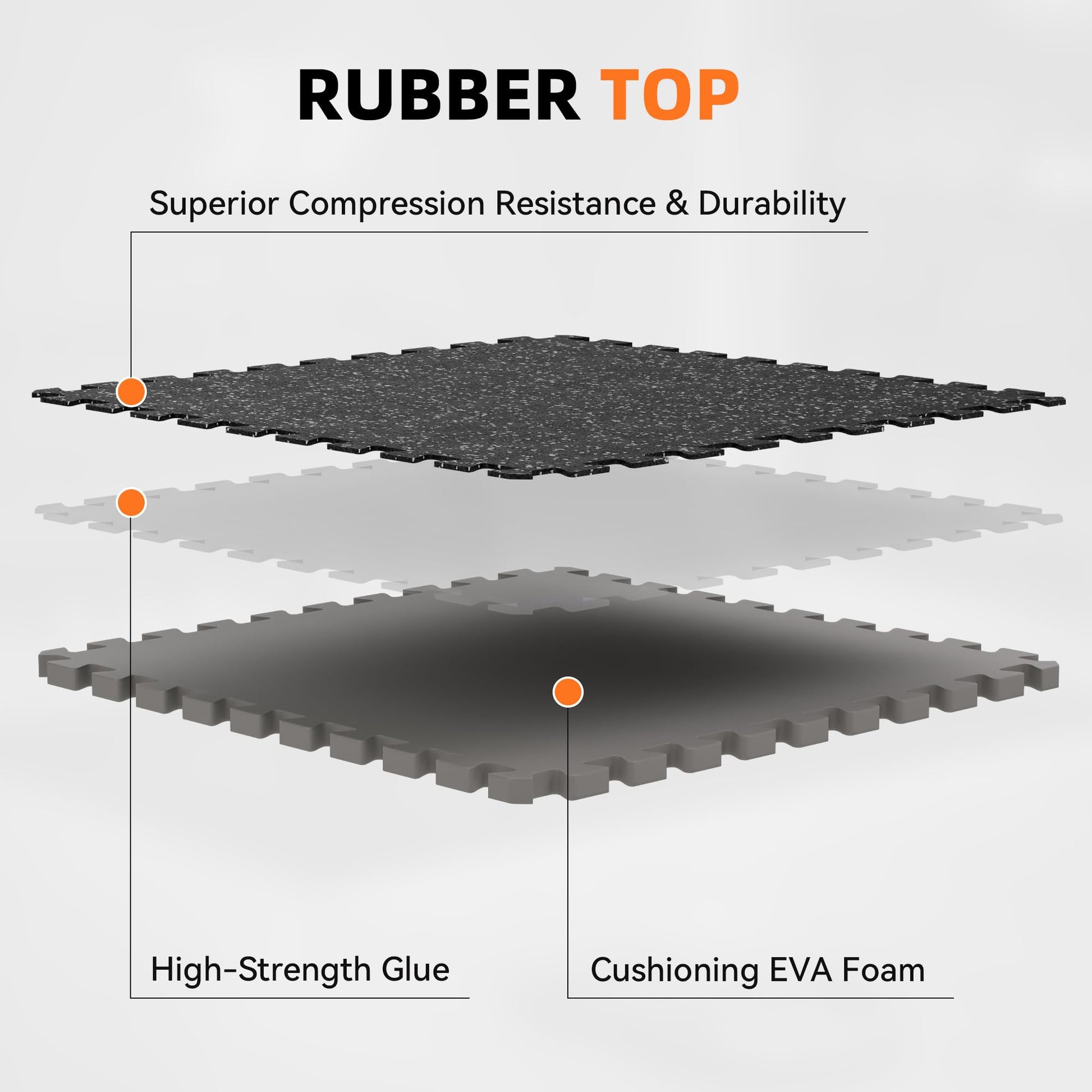 - TWO LYAERS AND 0.79' THICKEN FLOORS MAT: The thickness of our foam flooring tiles is 0.79'! More durable and tougher. A high-density EVA foam base combined with a sturdy EPDM rubber top. Rubber tiles are tough and strong Can easily hold the weight of heavy machinery for all of your needs. The mats safeguard your floor from scratches, scuffs and dents that can occur in a home gym from weights and dumbbells, medicine balls, jump ropes and more.