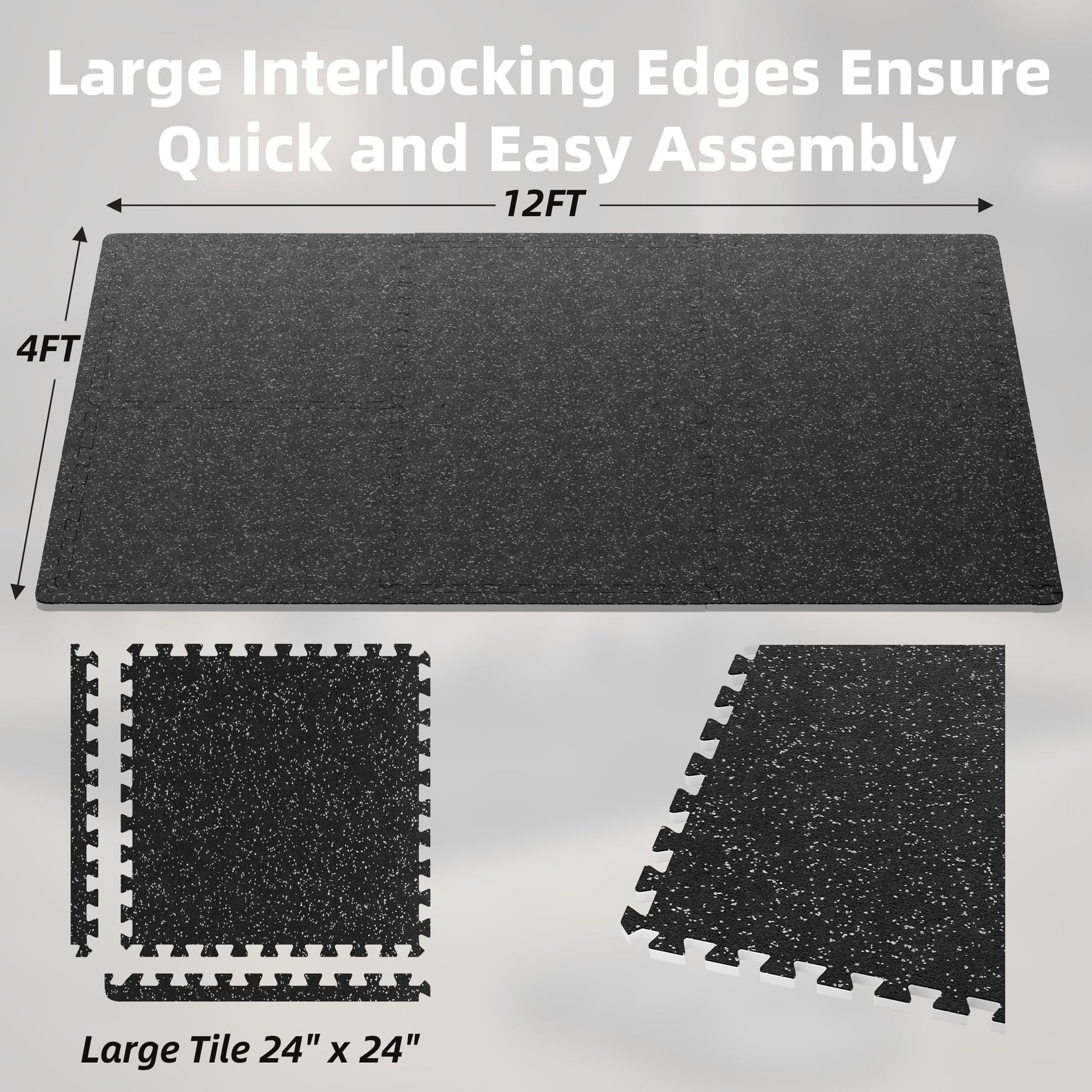 - EASY TO ASSEMBLE: The interlocking design allows you to quickly stitch together all the interlocking mats, just like a jigsaw puzzle.Each pack comes with 12 tiles and 24 borders to cover 48 square feet. It is easy to assemble making a perfect workout and training space. Each gym rubber flooring tile measures 24 inches x 24 inches x 0.79 inch. The puzzle exercise mats lock and grip together tightly so you can exercise without worrying about moving.