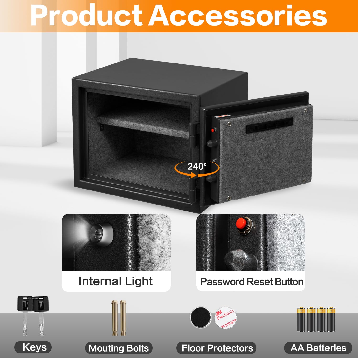 - 🔥🔥🔥Size: 1.2 Cubic Feet perfect space to conveniently store important documents, jewelry, cash and valuables with ease. Exterior Size: 15*11.8*11.8inches, Interior Size: 14*11.2*11.2 inches, Door Thickness: 2.7 inches.With Alarm System Fireproof Safe box,Enter Incorrect Passwords For 5 Times, Alarm Sound Will Last 20 Seconds , And The Safe Will Enter A 3minute Lockout