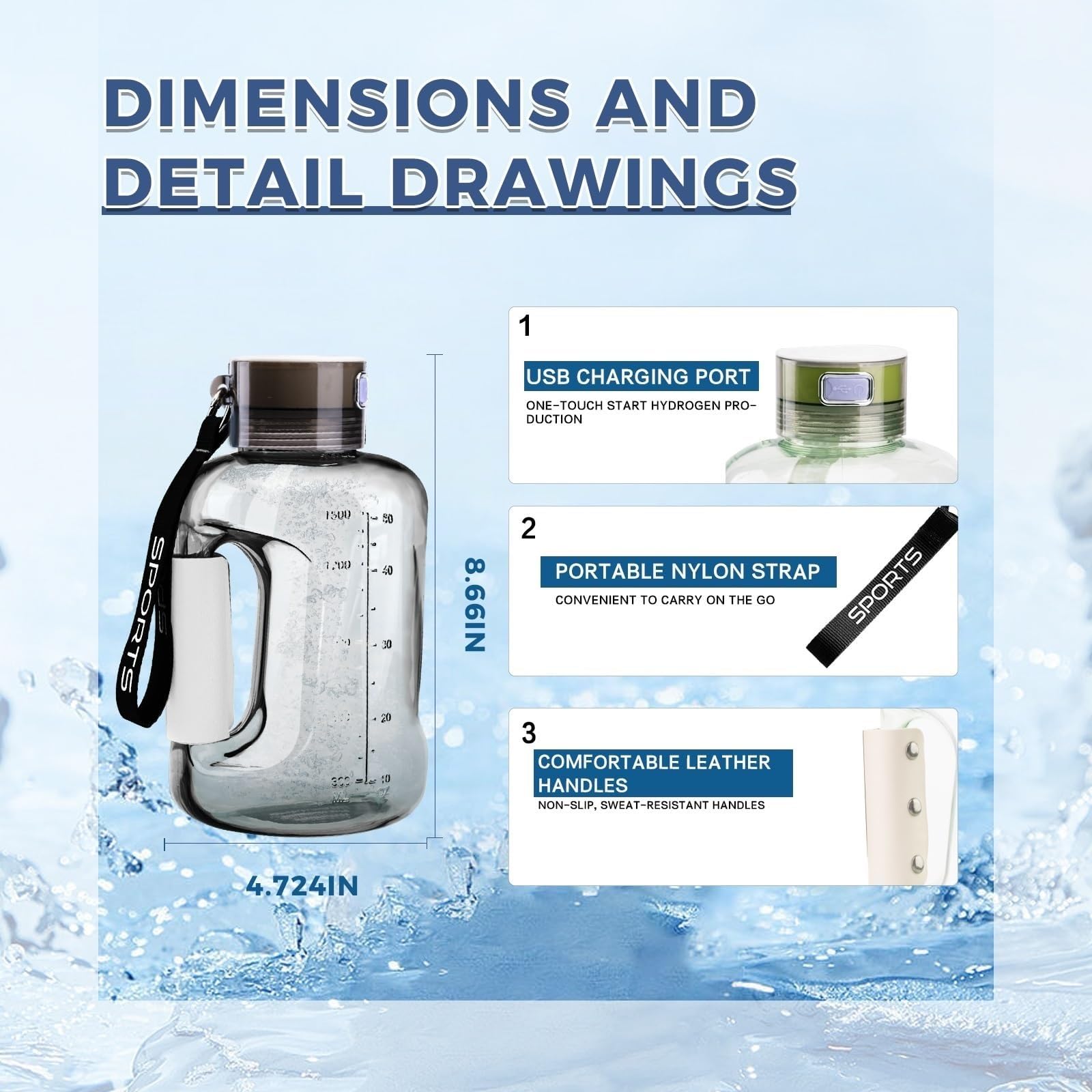 - 1.5 LITER LARGE CAPACITY: The hydrogen water dispenser has a capacity of up to 1.5 liters, which means it can produce a large amount of hydrogen-rich water for your day's water consumption. It can be used as a general sports water cup, such as playing basketball, running, working out, wrestling and so on.