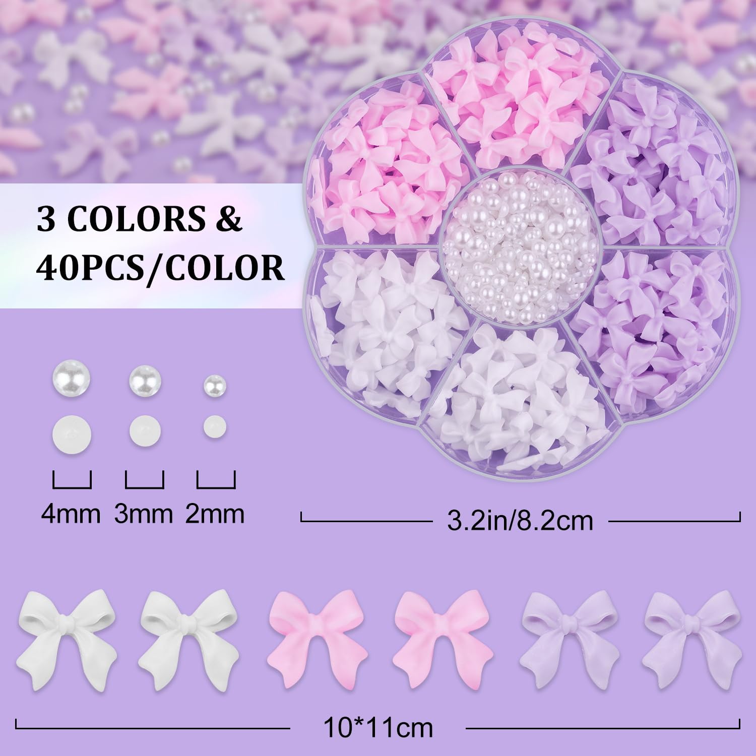 - π Great Amount: The nail bow charms are in 3 colors: White, Pink, Lilac, and divided into 6 grids by color. There are about 20 pcs of nail bow charms in the grids, approx. 120 pcs in total. This nail jewel set also comes with a grid of 2-4mm white nail pearls. It is a great amount and enough for you to design your special nail art style.
