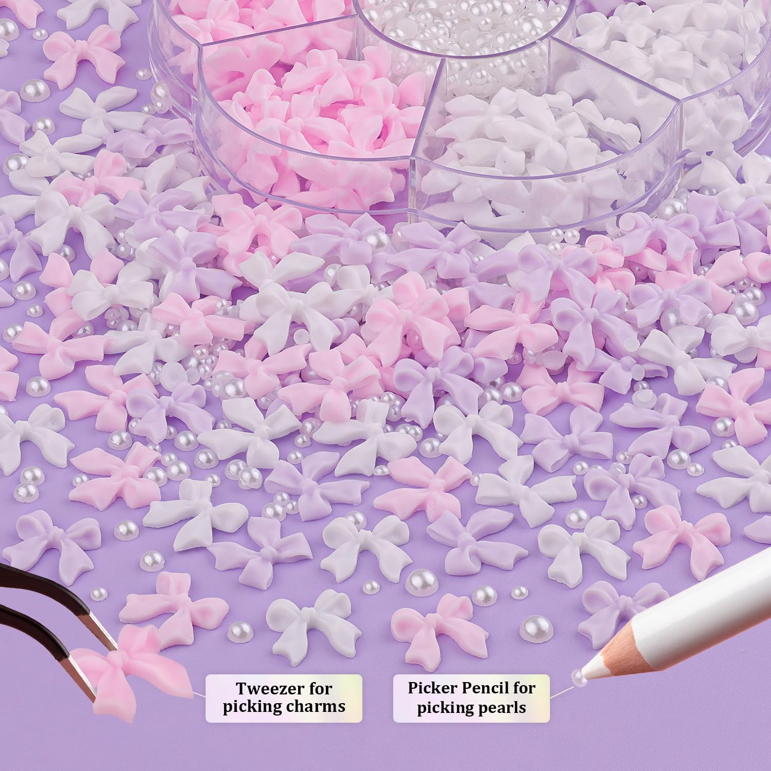 - π Package Contain: A box of bow nail charms and flatback pearls for nail design, a tweezer and a picker pencil to pick up the bow charms and small beads.