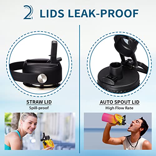- LEAK-PROOF 2 LIDS - AUTO SPOUT LID & STRAW LID let you can enjoy spill-proof sipping and fast drinking to meet your different drinking needs. The pop-up spout lid is designed for one-hand open and close, with a large water outlet for fast drinking. The straw lid lets you sip on the go, with perfect spill-proof sipping to all your outdoor adventures, and it can also prevent the inhalation of ice cubes