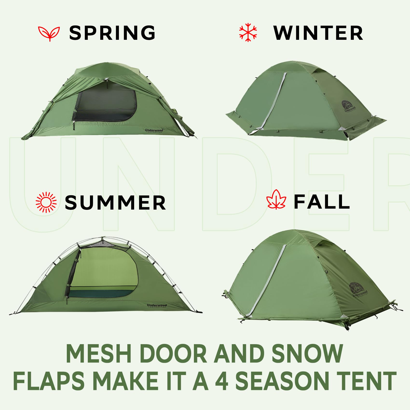 - FOUR SEASON TENT: While other 3 season tents are only available for spring, summer, and fall, this extreme weather tent is suitable for all seasons of the year. In winter, the snow skirt of this 1 person backpacking tent makes sure that it can keep snow away. The rollable design makes it convenient when there is no snow around. In other seasons, the mesh design of the 4 season backpacking tent keeps bugs away while the double-layer door ensures ventilation