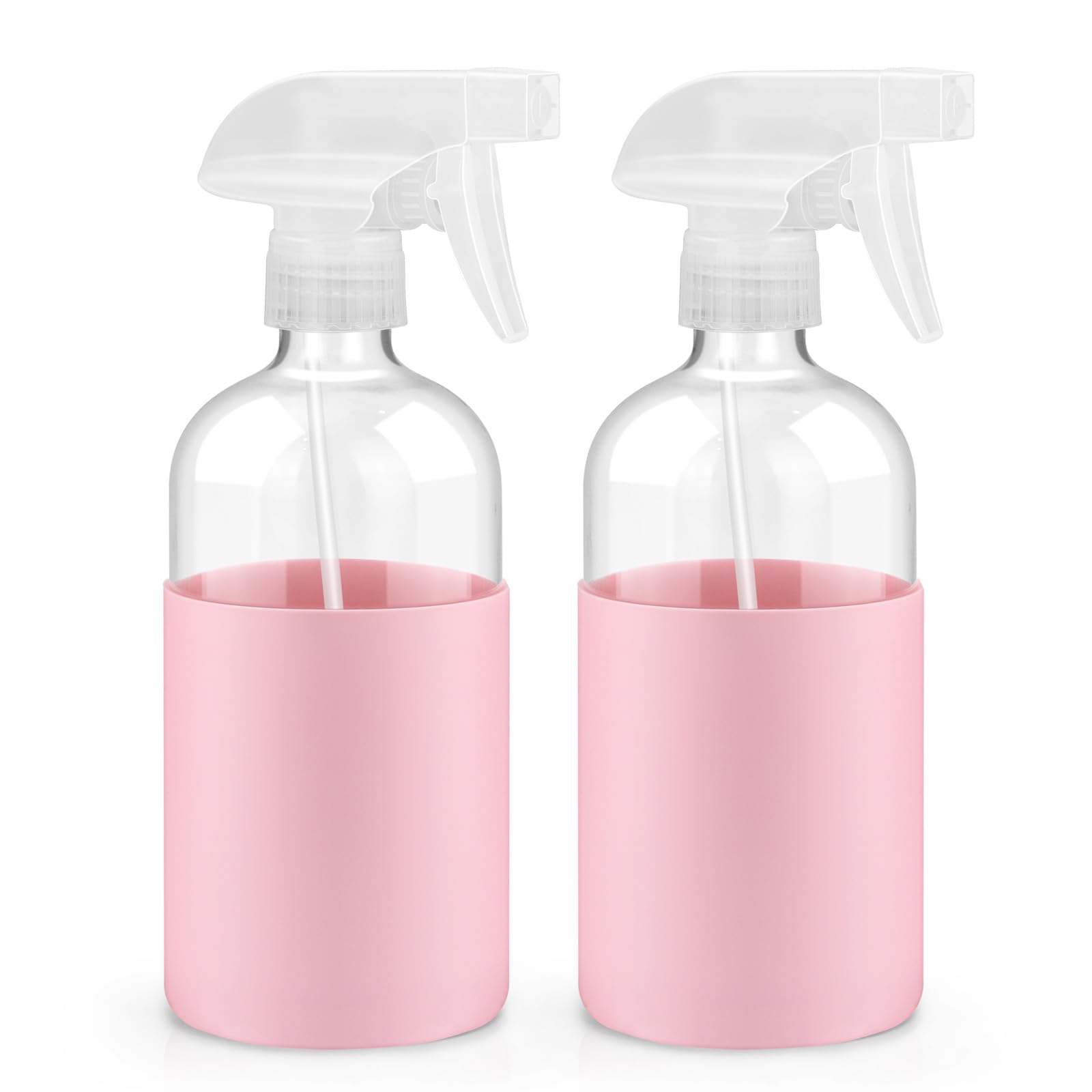 2 Pack Glass Spray Bottles with Silicone Sleeve, 16 oz Empty Refillable Containers with Adjustable Spray Nozzles, Spray Bottles for Hair, Cleaning Solutions and Plants White