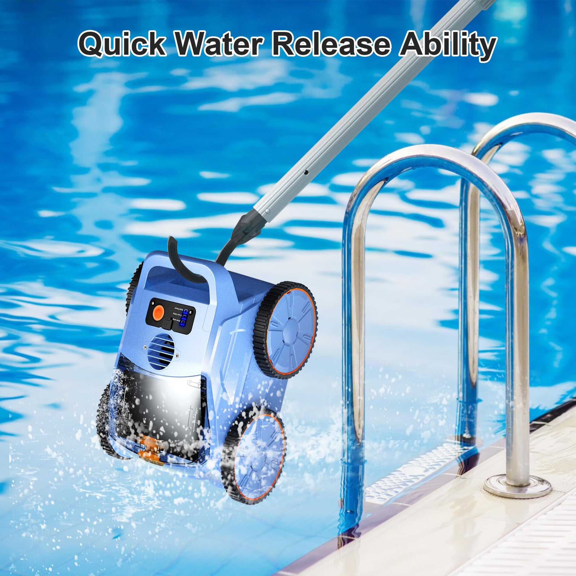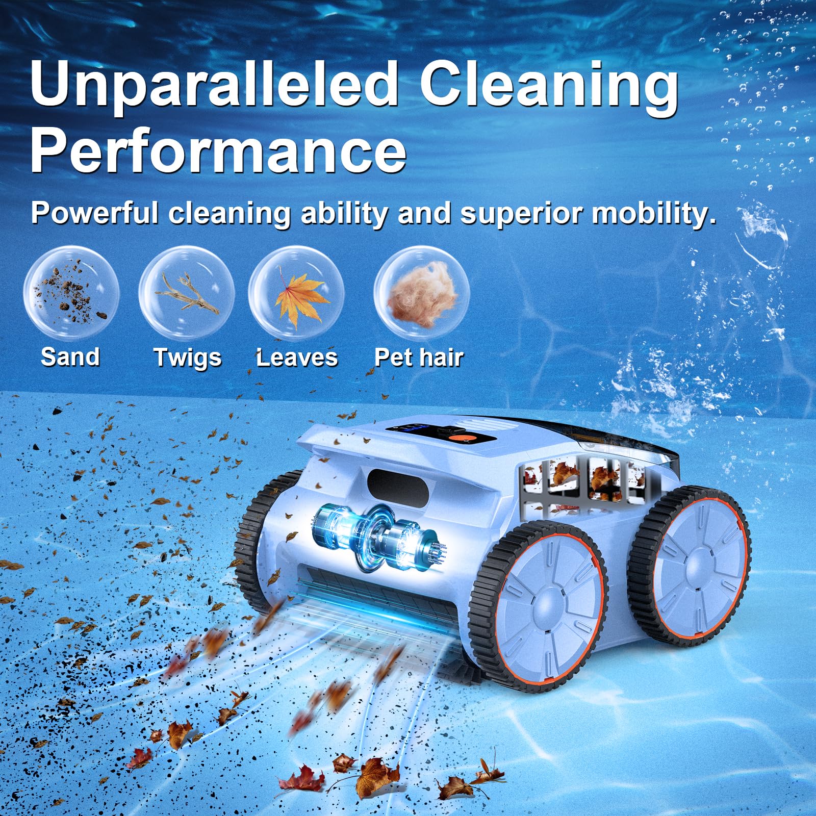 - 🐳 POWERFUL SUCTION: Equipped with 7800mAh battery, 180W brushless motor and 300 μm filter, this pool robot can thoroughly and efficiently remove all kinds of debris and trash from the pool surface. Robotic Pool Cleaner can work for up to 150 minutes on a single charge. This new pool robot is suitable for in-ground pools with an area of 1614 Sq.ft and a depth of up to 9.8 feet.