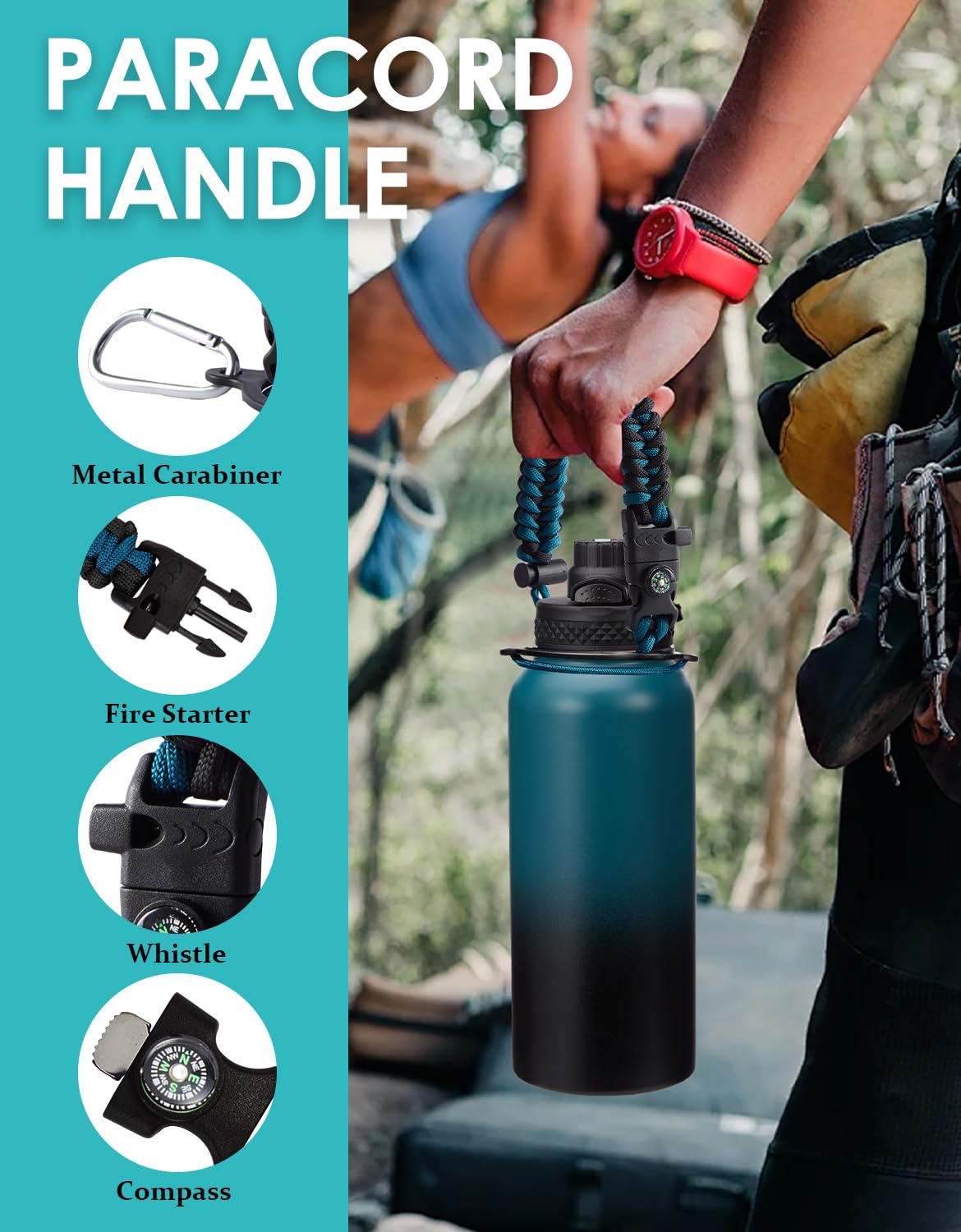 - PERSONALIZATION BOTTLE PARACORD HANDLE - Quarter gallon water bottle with a pretty cool functional paracord handle which does more than meets the eye.?The survival strap cord is made of military-grade nylon and comes with a compass, safety loop, metal carabiner, flint, igniter, and whistle, making it a functional and stylish addition to your thermo water flask, is perfect for outdoor camping, hiking, fitness enthusiasts