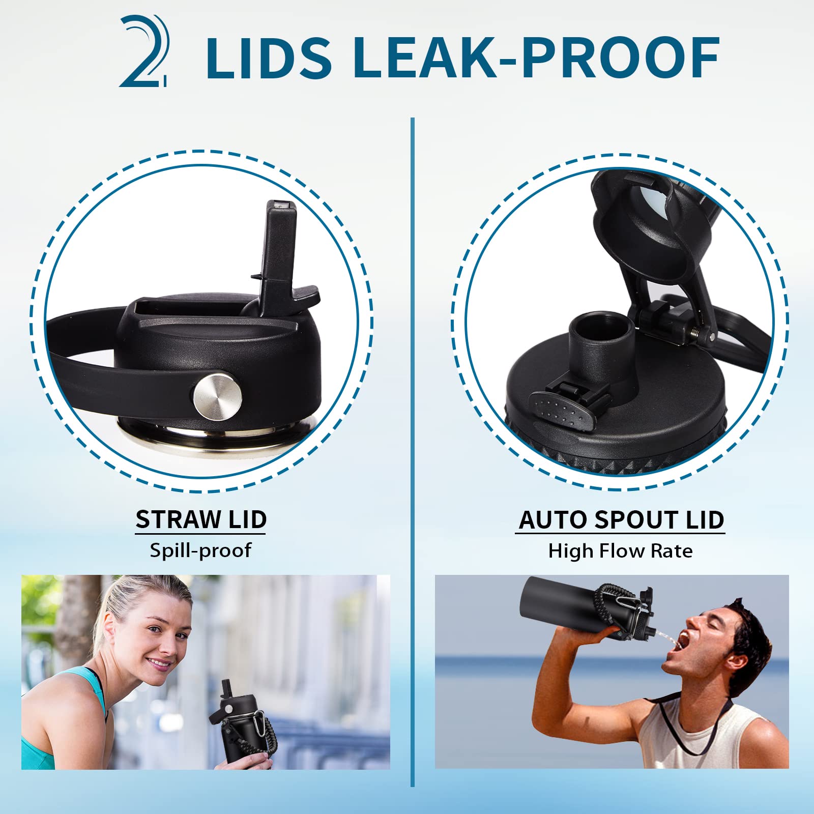 - LEAK-PROOF 2 LIDS - AUTO SPOUT LID & STRAW LID meet you different drinking need, and both lids are leak proof and with handle for carrying on the go. The pop-up spout lid features a button for one hand open quickly, and a large water outlet for fast drinking. The straw lid with straw lets you enjoy spill-proof sipping to all your outdoor adventures, also can prevent the inhalation of ice cubes