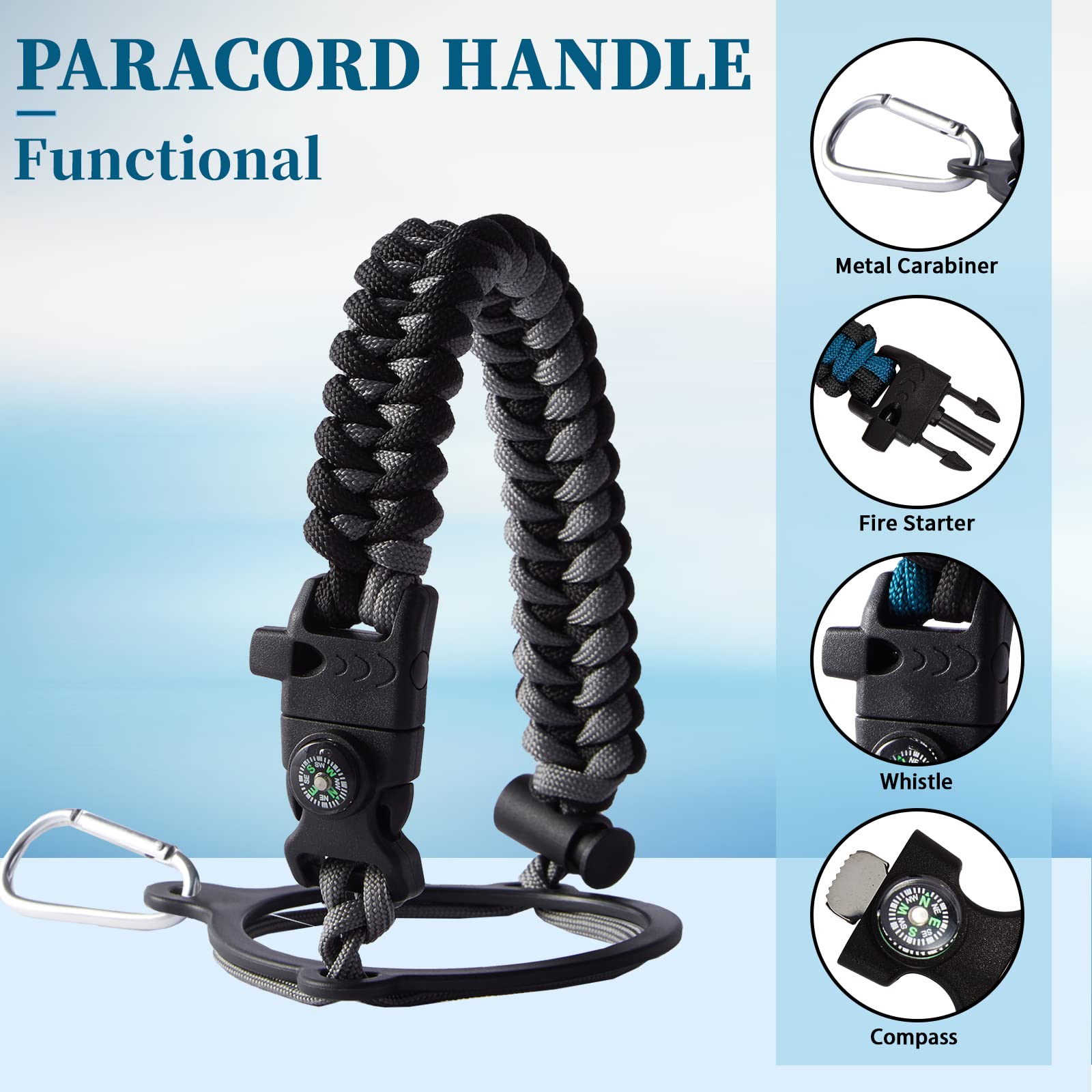 - PERSONALIZATION BOTTLE PARACORD HANDLE - Thermo water bottle with a pretty cool functional paracord handle which does more than meets the eye. The survival strap cord made of military grade nylon, with compass, safety loop, metal carabiner, flint, igniter and whistle. Can help you out if you were in a survival situation while hiking, camping or everyday life