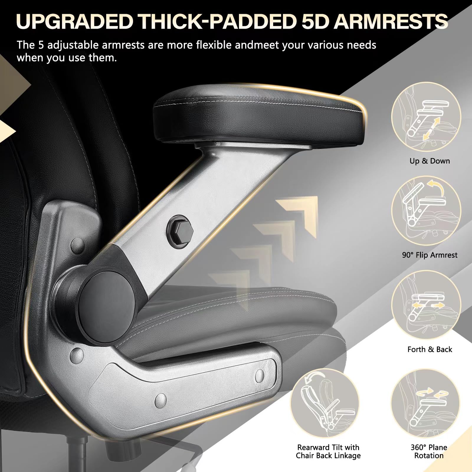 - đăSpace-Efficient 5D Armrests with Optimized Utilizationă:Need a stylish large home office chair for your work-from-home or shared office setup? No problem! The big and tall office chair with its ergonomic 5D flip arm design minimizes spatial requirements. The arm rests can be mounted on the back and then you can push them back for no arm rest which is very comfortable and handy. Prepare to swivel and roll your way to productivity paradise! This large desk chair doesn't just sit there looking pretty. It's a multitasking marvel