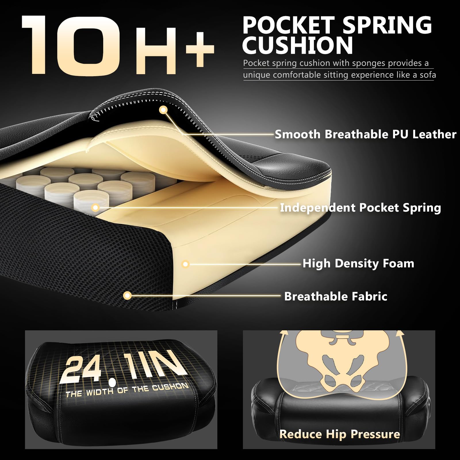 - đăExtra Wide Breathable PU Leather Large Office Chairă:Our executive office chair is equipped with a spring cushion to reduce hip pressure. The extra-wide chair backrest and independent lumbar support gently wraps your body and supports your lower back, thoughtfully designed to keep you comfortable during long hours of working, studying or gaming.