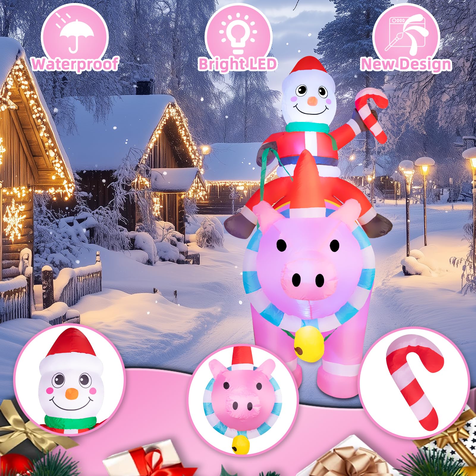 - 2024 New Design with Santa and Pink Pig: This 7FT Christmas inflatable showcases a fresh 2024 design featuring Santa and a charming pink pig, adding a whimsical touch to your outdoor holiday décor. It’s perfect for creating a festive atmosphere in your yard, garden, or outdoor spaces.