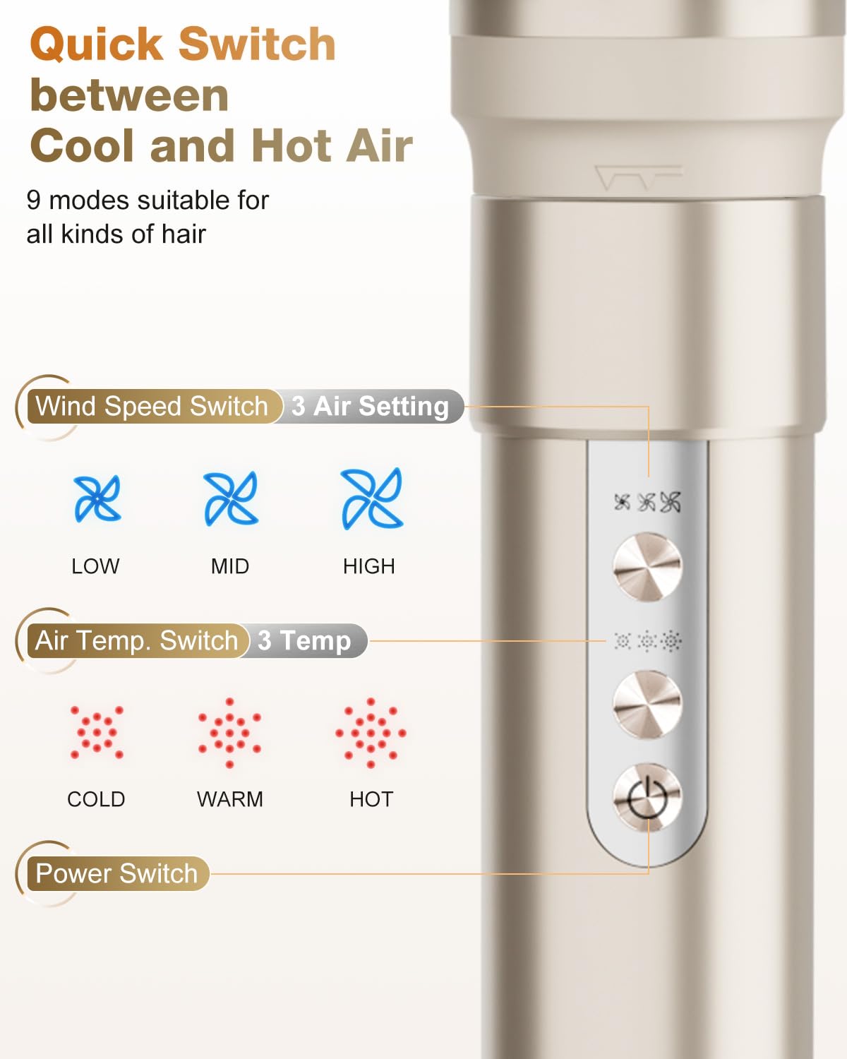 - SAFETY FIRST - We prioritize safety with an NTC feedback system, a bi-metal thermal switch, and an irreversible fuse. The hot air brush offers a quick cooling function by double-clicking the temperature button. Comes with heat-insulating gloves in case of burns. The air styler for hair curling with an Ergonomic button design, concentrated on the upper part of the body, prevents accidental clicks, also we added an ALCI plug to this hair-drying brush.