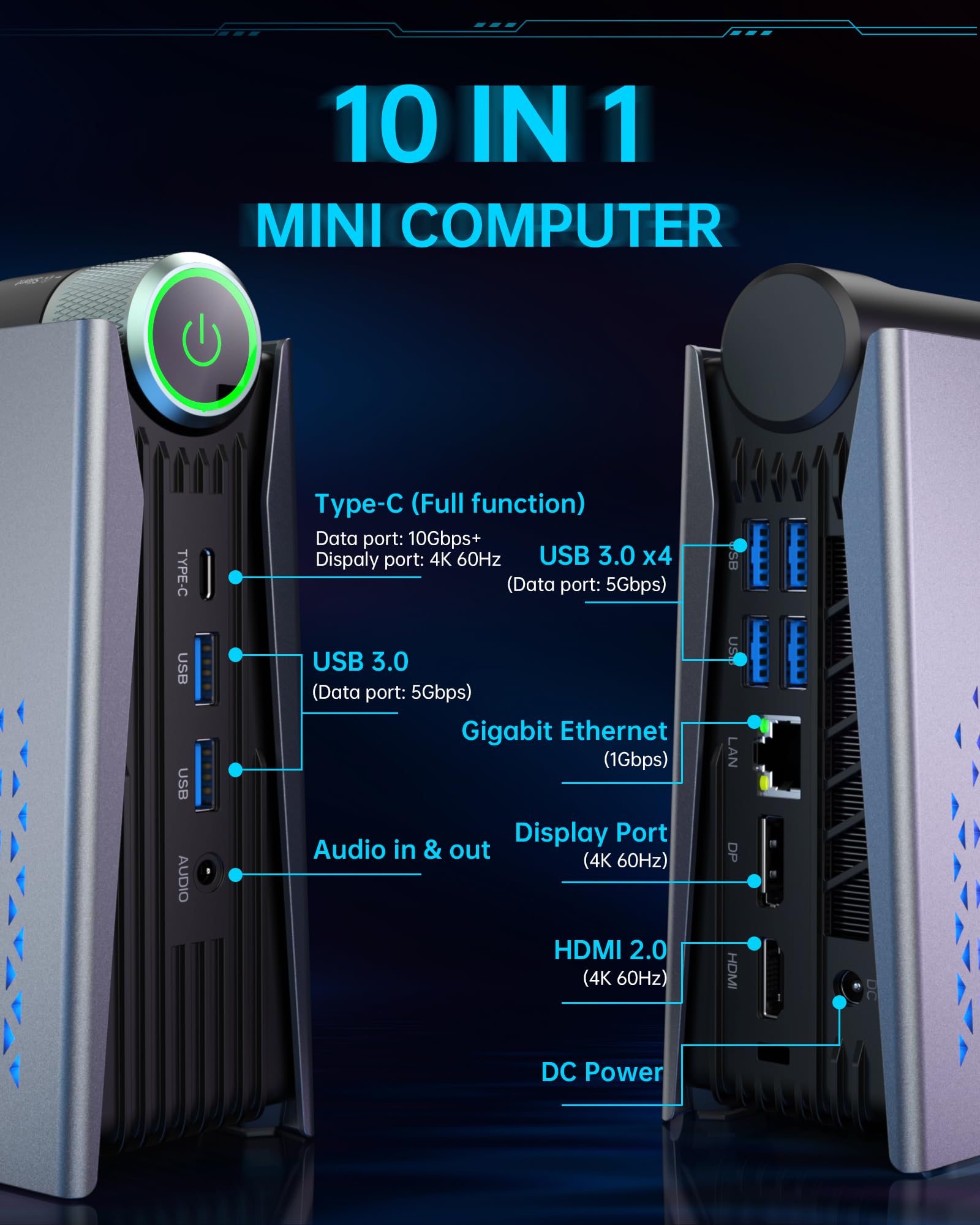 - [Multi-Mode Mini PC] Take your gaming to the next level with our multi-mode mini PC - choose from silent, auto, or performance mode to suit your needs and enjoy smart energy-saving features. ① Silent mode, fan sound as low as 38db and the power of mini pc is reduced to 10-15W, smart energy saving; ② Auto mode, suitable for medium work or entertainment projects, the mini pc power is setting as 15-20W; ③ performance mode, you can crank up the power to 20-25W, upgrade your gaming experience