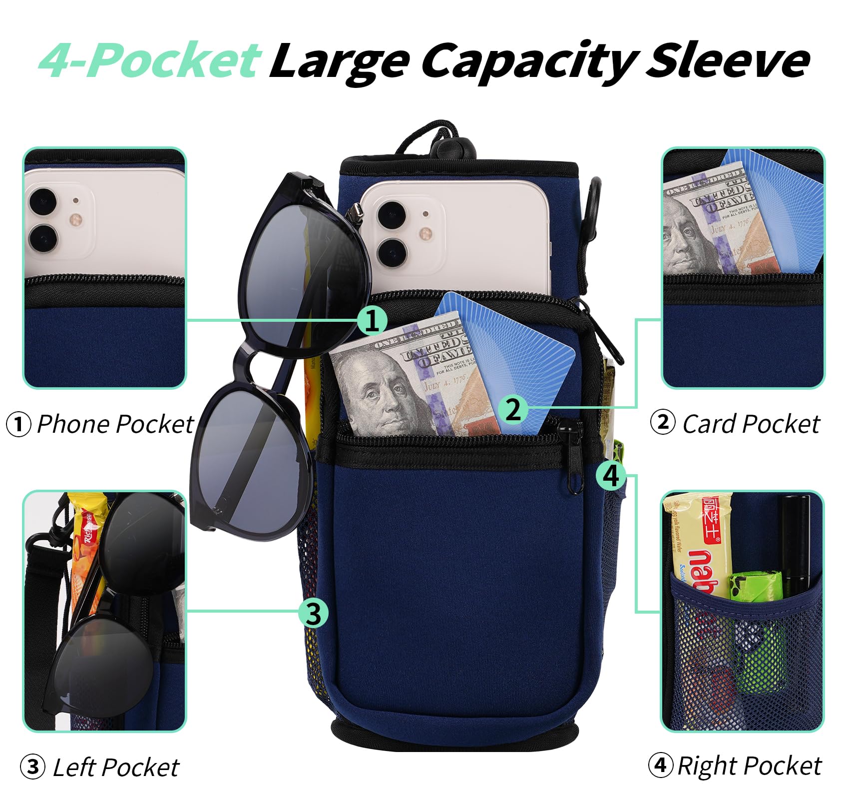 - 【Large 4 Pockets】Our water bottle sleeve provides spacious space for all your personal items. The two front zippered pockets can securely hold your smartphone(up to 7 inchs), keys, cards and other essentials. The two side mesh pockets are ideal for storing sunglass, snacks. You won't need an additional bag when you're on the go.