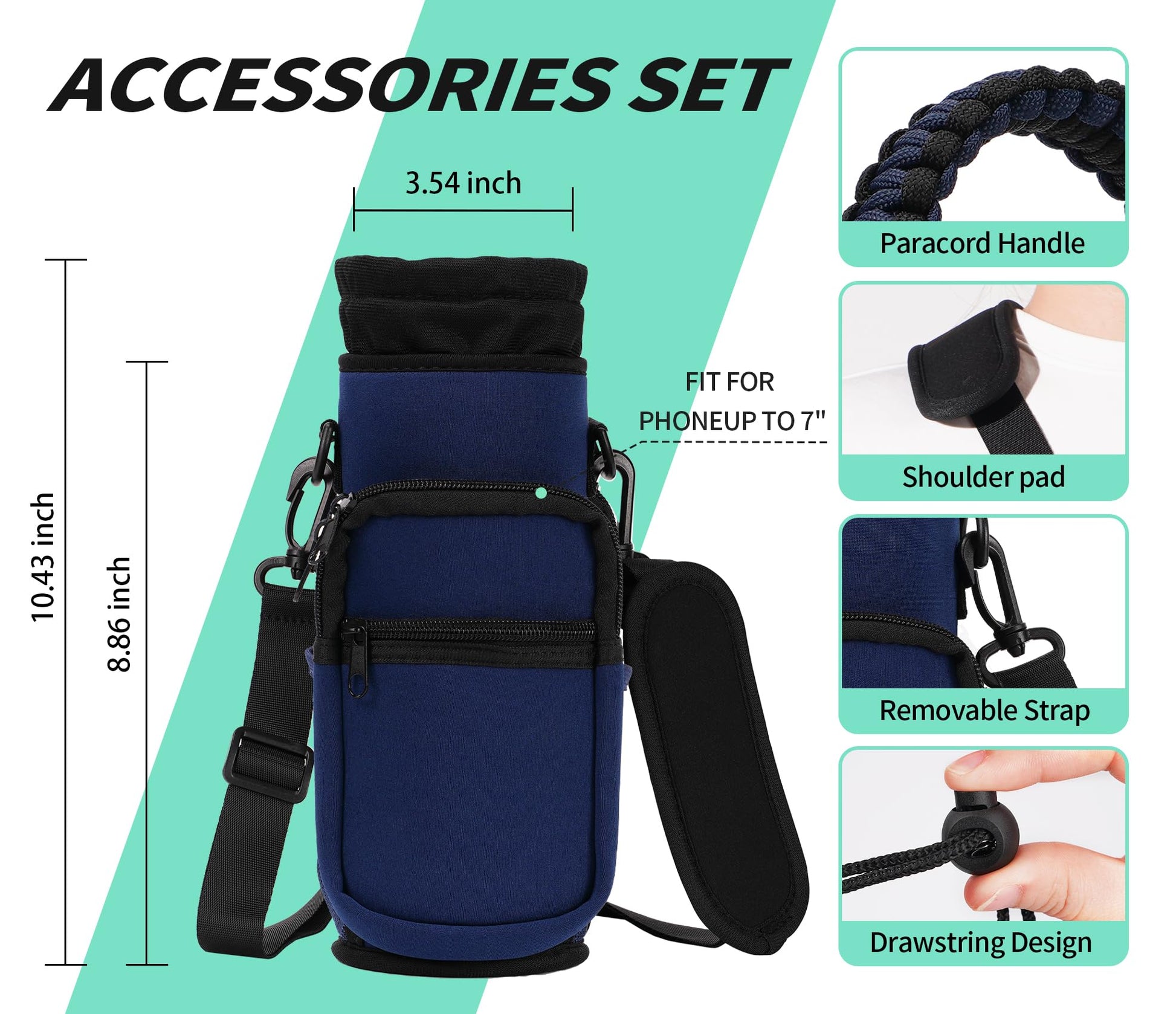 AceTreker Water Bottle Carrier Bag, 32 oz/ 40 oz Water Bottle Sleeve with Paracord Hanlde & Strap, Neoprene Insulated Metal Canteen Pouch Holder with Phone Pocket for Gym, Sport, Fishing-Navy