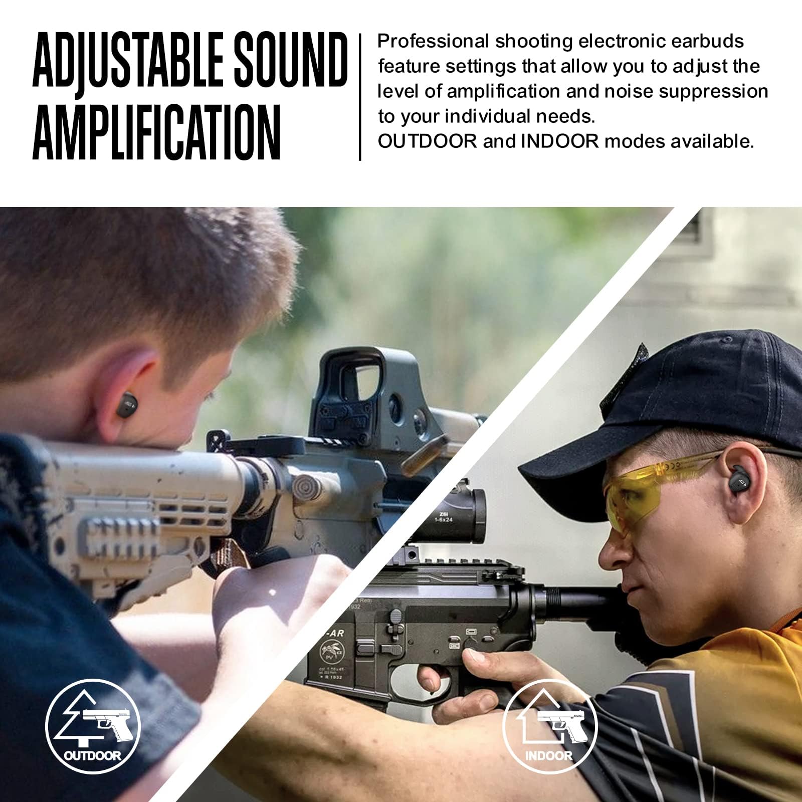 - SHOOTING EARBUDS: In-ear ear protection earbuds enhance quieter sounds while reducing loud ones during shooting and hunting. Lighter than earmuffs at 0.27 ounces, they're comfortable and come with a 24-hour charging case—ideal for shooting range ear protection.