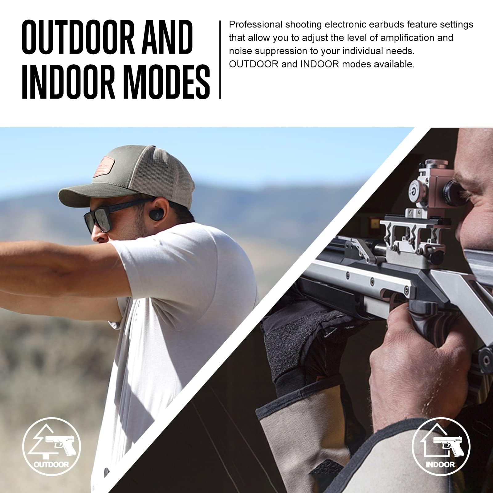 - TWO NOISE REDUCTION MODES: Indoor and outdoor modes reduce echo and reverberation. Compared with other earbuds, the ear muffs for noise reduction pay more attention to professionalism, the mode is simple, and it quickly enters the shooting hearing protection mode. Button operation is more convenient than touch for shooters.
