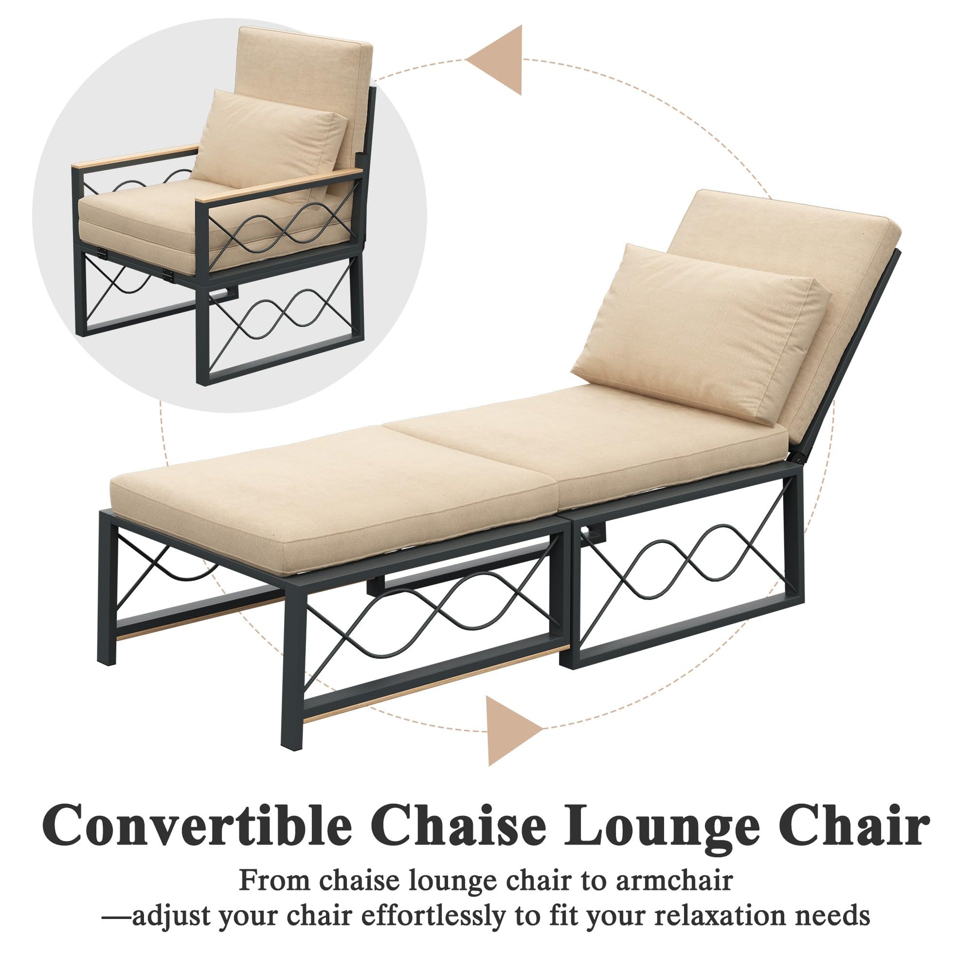 AECOJOY Outdoor Metal Chaise Lounge Chair Set of 2, Patio Convertible Armchair with Cushions, Adjustable 5-Position Recliner with Full Flat Tanning Function for Outside, Pool, Beige, 2 Pack