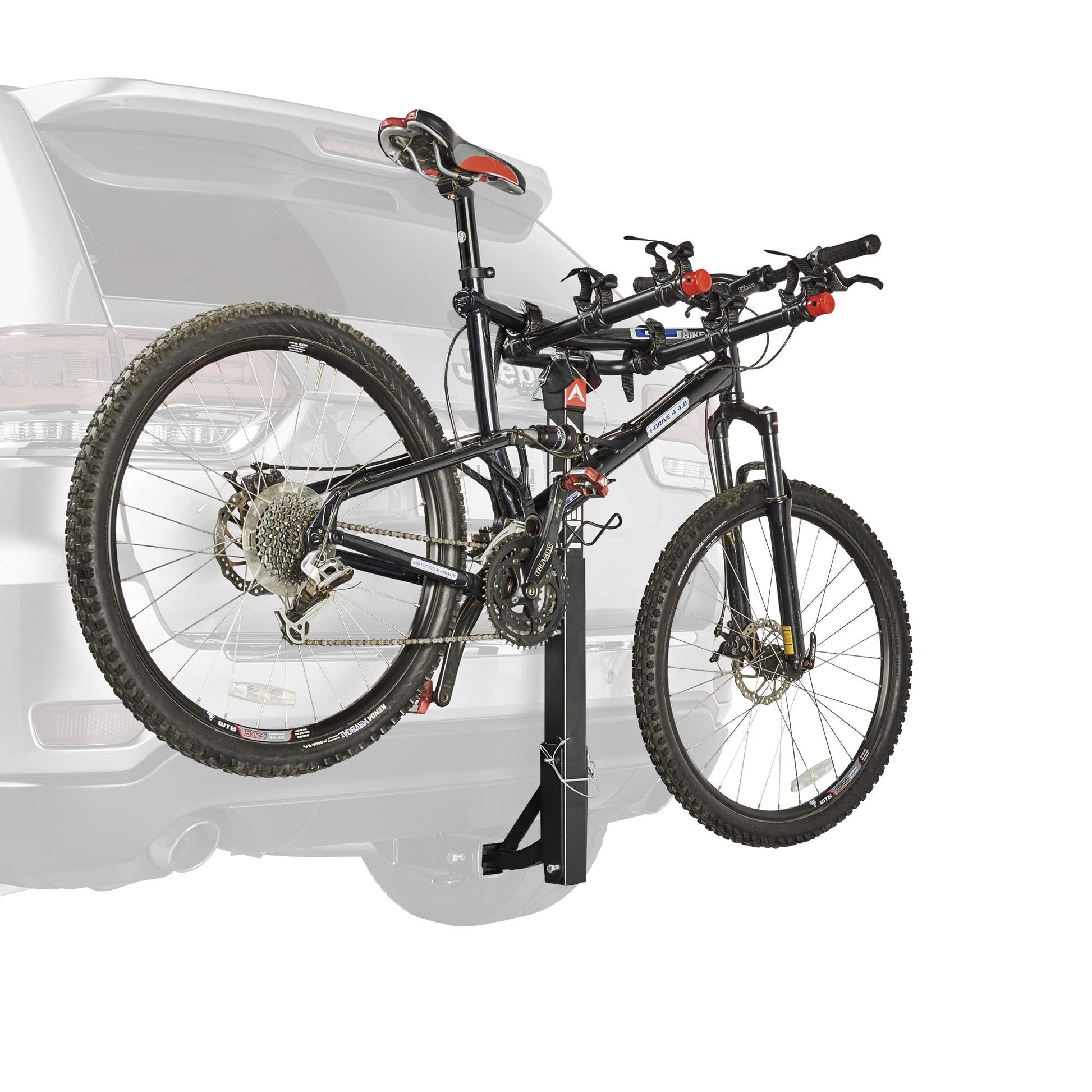 Details: Carry arm spacing accommodates a wide range of frame sizes and designs. Tie down cradle system individually secures and protects bikes. Carry arms fold out of the way when not in use. Rack tilts back for easy lift gate access. No wobble bolt eliminates movement of rack inside hitch. All retainers’ clips attached w/ lanyards. Minor assembly required. Black power coat finish.