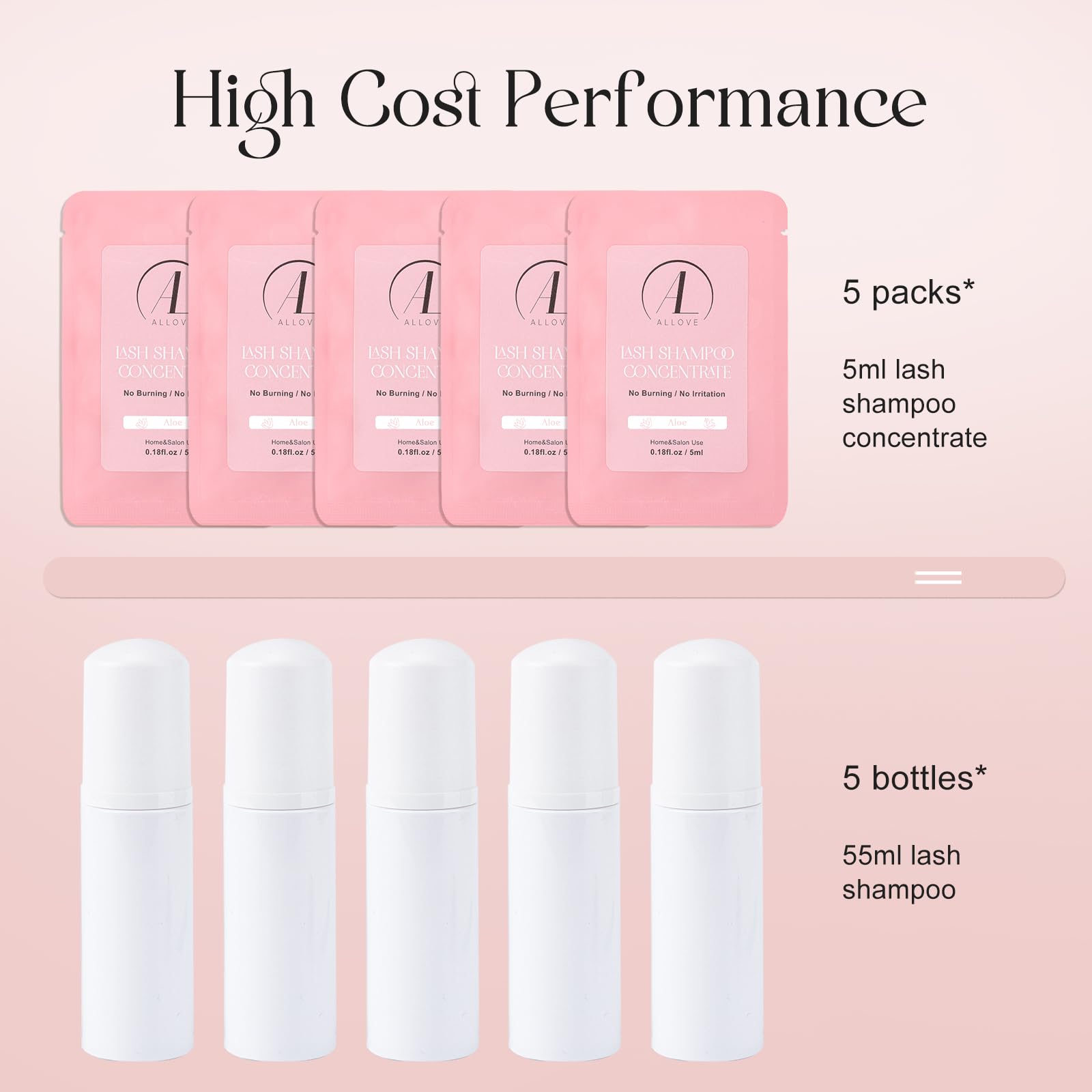 ALLOVE Lash Shampoo Concentrate for Sensitive Lash Extensions - Non-irritating Cleanser for Salon & Home Use, 5ml*5 Pack - Unscented