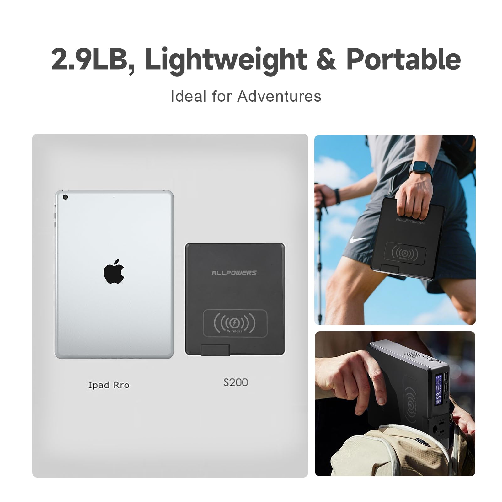 - 5 Outputs (Include Wireless Charging): ALLPOWERS portable power station (154WH) offers versatile charging with 1 x AC port (200W, peak 240W), 2 x USB-A ports (5V/3A), 1 x USB-C port (5V-12V, auto-adjusts voltage), and a wireless charger (5V/2.1A) for convenient charging on the go