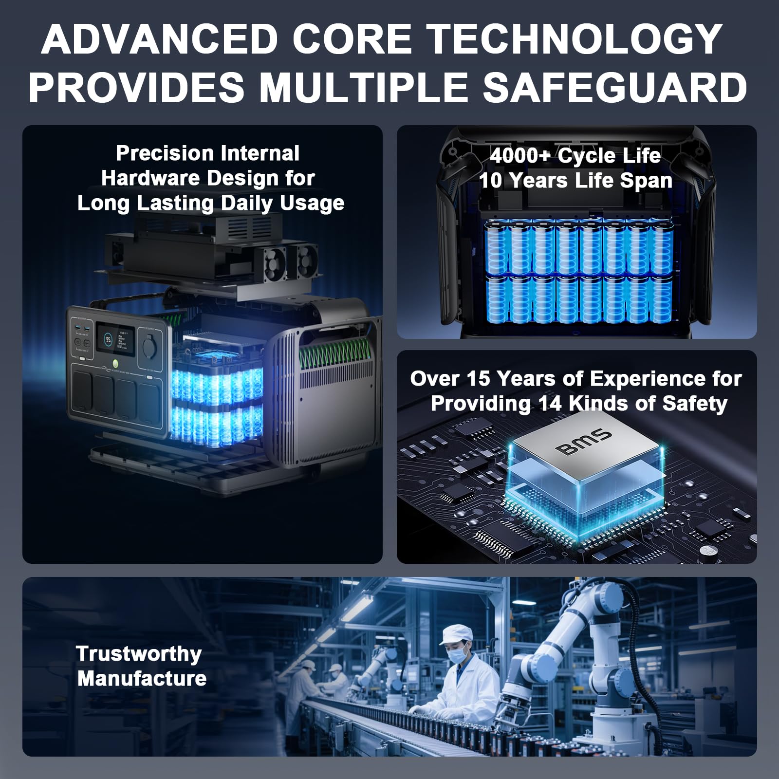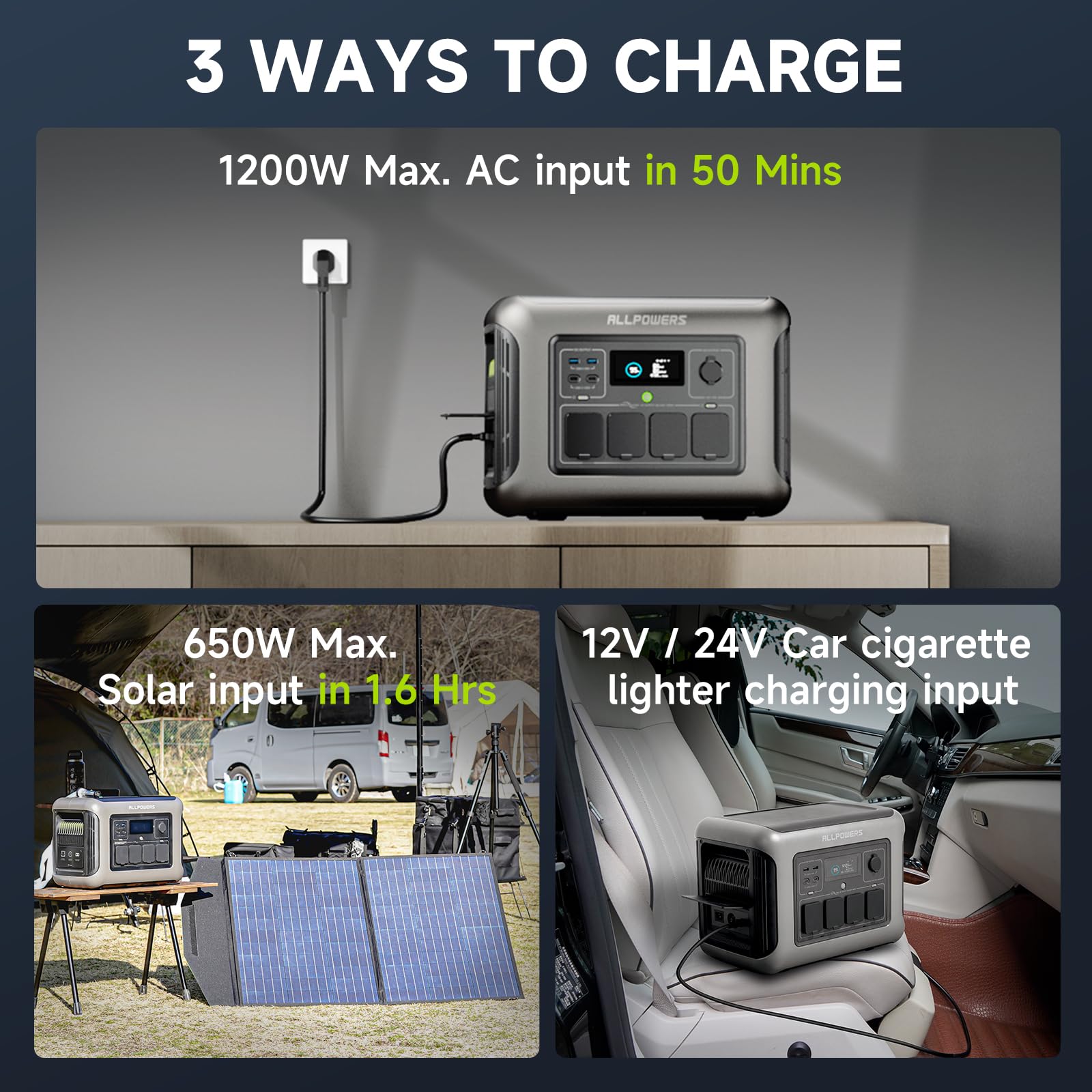 - All-in-One Energizes Your Trip: ALLPOWERS R1500 LITE delivers 4* AC 1600W output (3200W Surge), 2*UBS-C 100W port, 2*USB-A port and a cigarette lighter. You can charge your 9 devices at the same time and 1056Wh capacity can meet longer using time. Great choice for outdoor camping, RV, and home backup power.