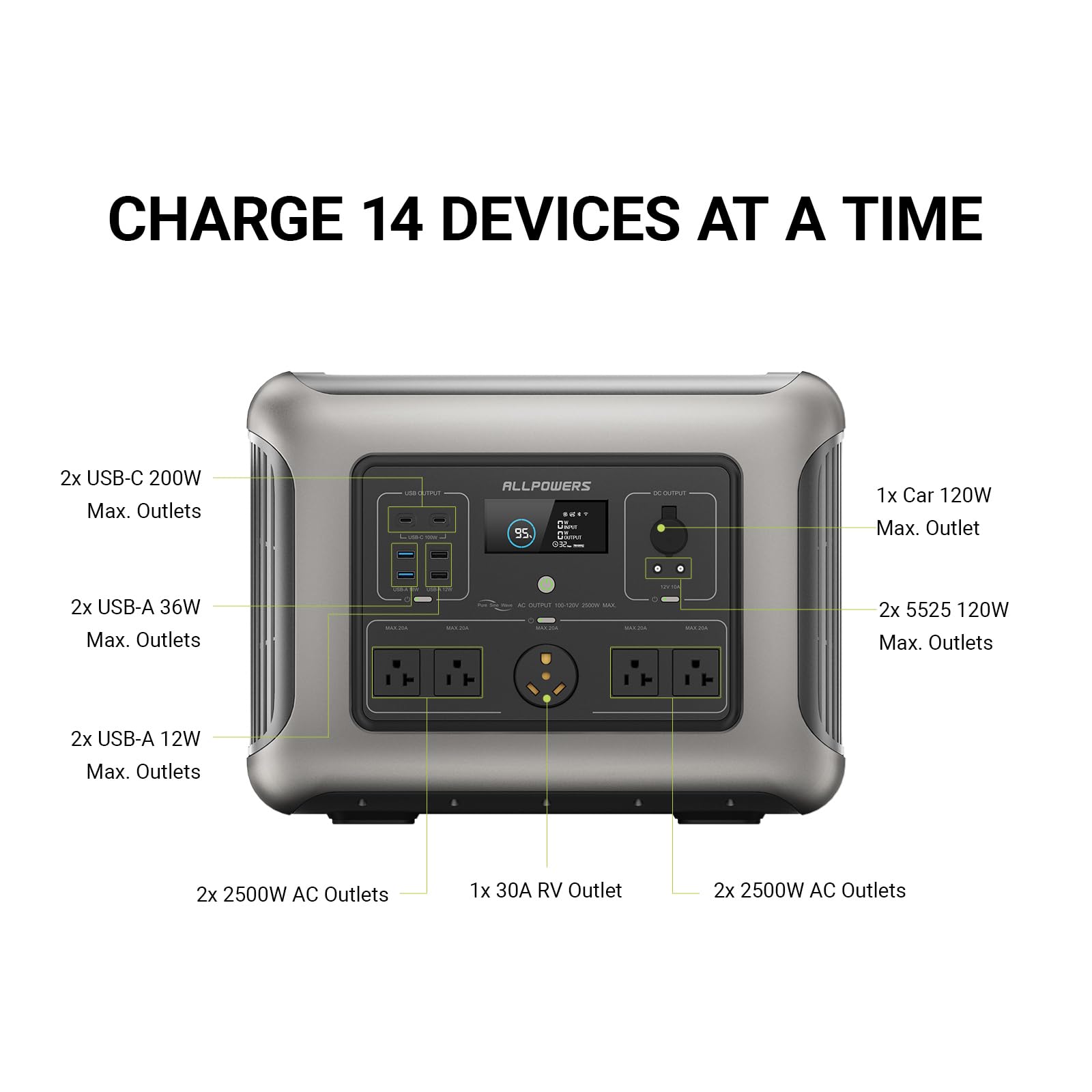 - 【Power 99% of Electrical Appliances】: With huge rated power of 2500W (Peak 4000W), ALLPOWERS R2500 is ready to power 99% of indoor and outdoor appliances- electric vehicles, TV, fridge, coffee maker, air conditioner, toaster, microwave oven, CPAP, drill, Juicer, hair dryer for long time. With 1500Wh battery pack, it features 4* AC outlets, 1* RV outlet, 2* PD 100W USB-C ports, 4* USB-A ports, 2* DC ports, 1* Car socket. 30A RV Outlet is very suitable for long-distance outdoor RV travel.