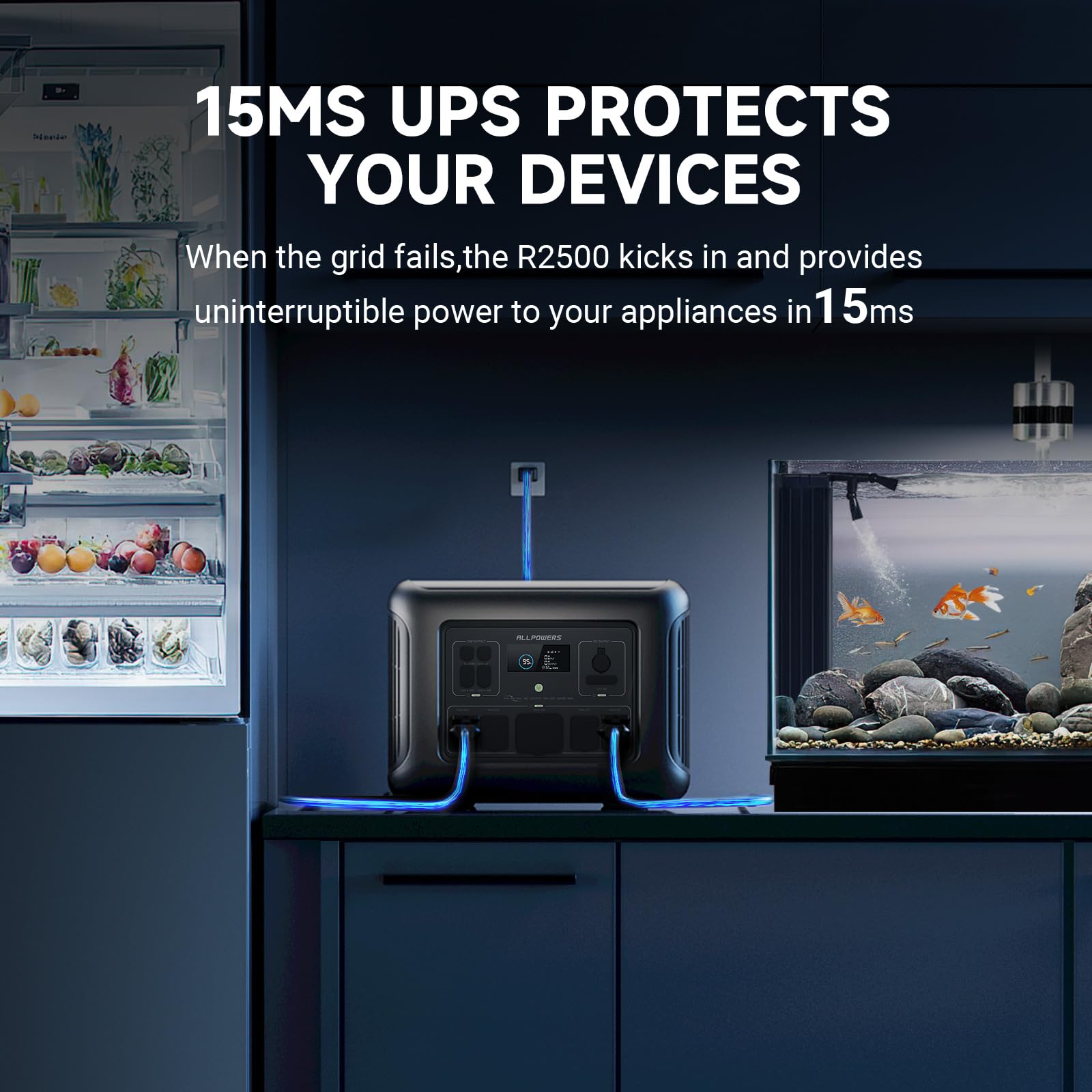 - 【Smart Control Function & UPS Function】: Easily realized by connecting to ALLPOWERS APP through WIFI/ Bluetooth Power Monitoring/Function Setting/Remote Control/System Upgrade. R2500 is equipped with less 15ms UPS to ensure the safe operation of CPAP, fish tank, refrigerator or computer when sudden power failure.
