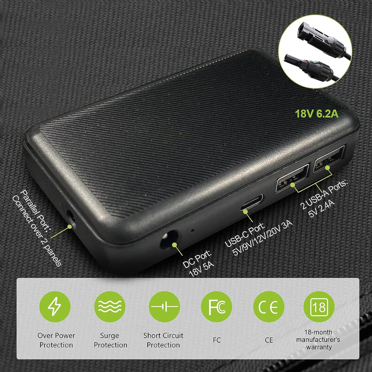 - ▶5 Output For Your Need: Solar-M-C-4 Output can deliver 25A(max)current, Dual USB-A port(5V/2.4A per port) for charging your 5V powered gadgets, and 18V DC outputfor charging your 12V car battery and portable generators, PD60W USB-C output for charging your laptop fastly. The junction box parallel connecting port for connecting multiple foldable solar panel.