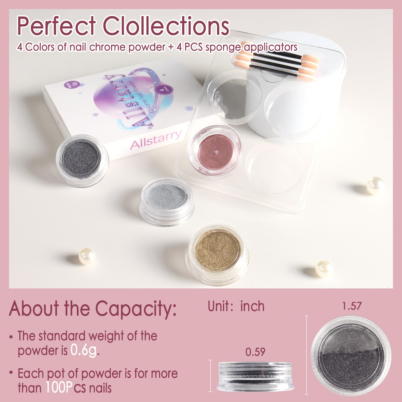 - Wide Usage: Allstarry Chrome Nail Powder Set is with 4 colors, including rose gold, dark gray, gold, silver, meeting your needs for different colors for different works. The colorful nail powder can be applied on UV gel nails, acrylic nails, natural nails, and it can be mixed into nail gel polish for its solvent resistance. It is a multifunctional DIY dye for decorating your home, cell phone's case, glasses, body art, and more.