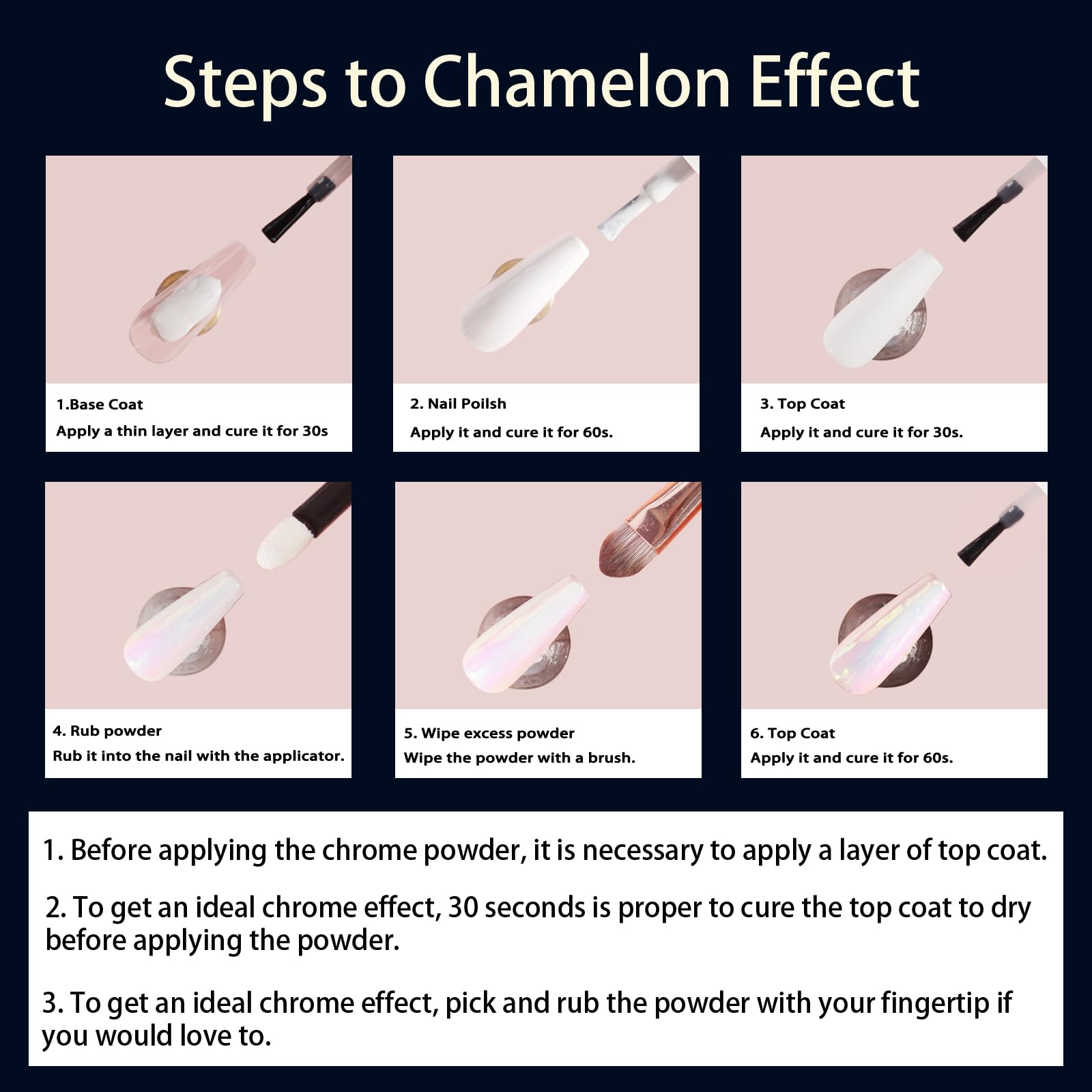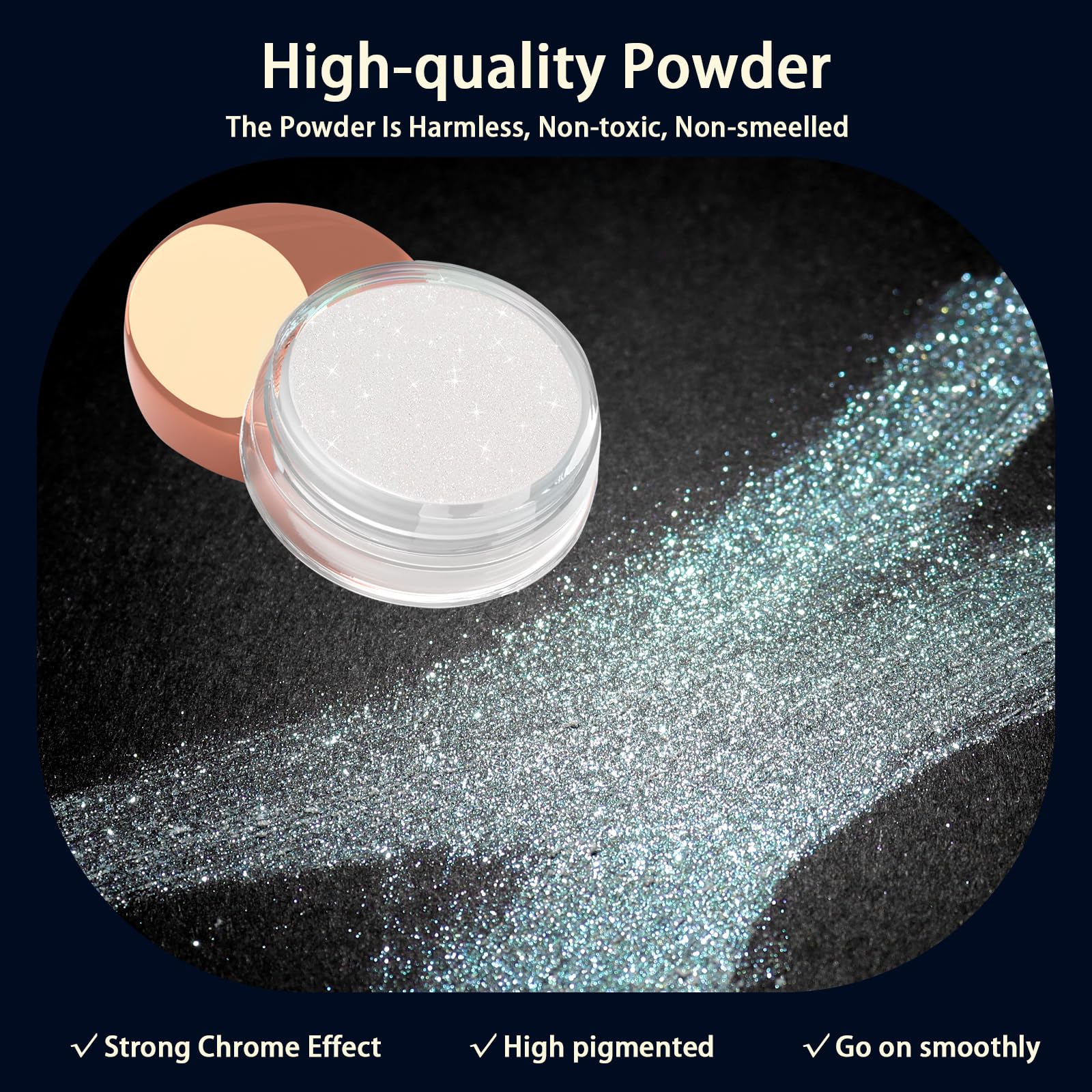 - Amazing Moonlight Effect: The white chrome nail powder looks white and glitter, and gives a moonlight shade to nails, its color changes with the base color to achieve various chrome effects. The pearl chrome nail powder is suitable for pearl nails, candy/ice/glass effect nails, mermaid/unicorn effects, mirror effect nails, or opal nails.