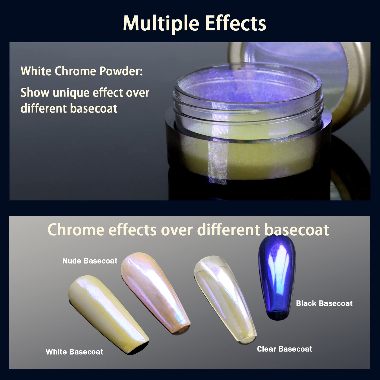 - Amazing Moonlight Effect: The white chrome nail powder looks white and glitter, and gives a moonlight shade to nails, its color changes with the base color to achieve various chrome effects. The pearl chrome nail powder is suitable for pearl nails, candy/ice/glass effect nails, mermaid/unicorn effects, mirror effect nails, or opal nails.
