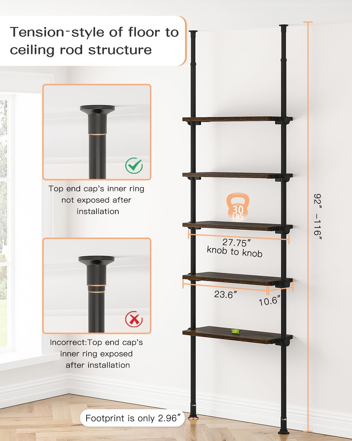 - 【Tension Mount Design】ALLZONE bookshelf features a modern tension-style design that uses a floor-to-ceiling rod structure. Unlike traditional tall bookcases, it takes up minimal floor space and fits perfectly in small, narrow areas, exploiting the wall space without eating up the floor area, giving you a tidy and clean study room