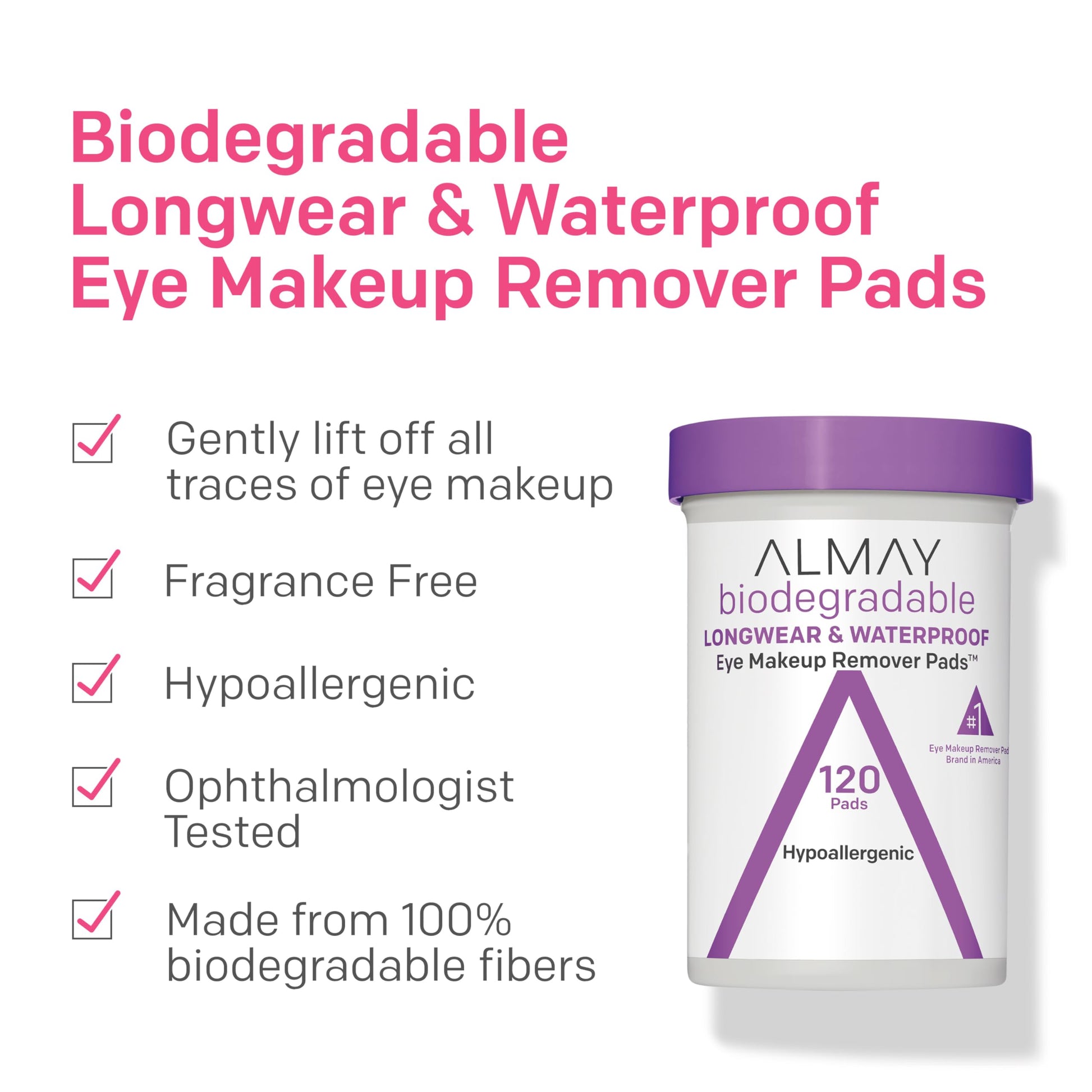 Almay Biodegradable Makeup Remover Pads, Longwear & Waterproof, Hypoallergenic, Fragrance-Free, Dermatologist & Ophthalmologist Tested, 80 Count