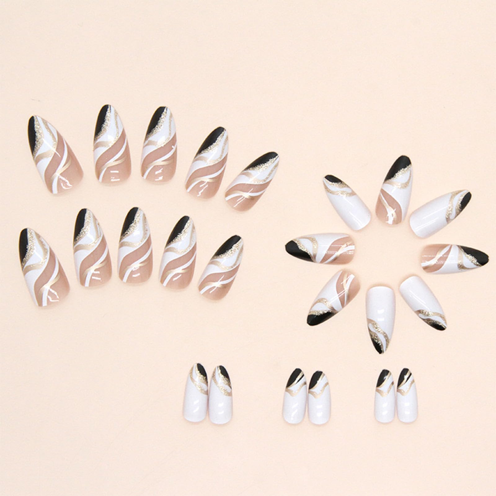 Almond Press on Nails Short Fake Nails White False Nails Press ons with Designs Gold Glitter Black Glue on Nails Glossy Full Cover Acrylic Nails Artificial Stick on Nails for Women Decorations 24Pcs