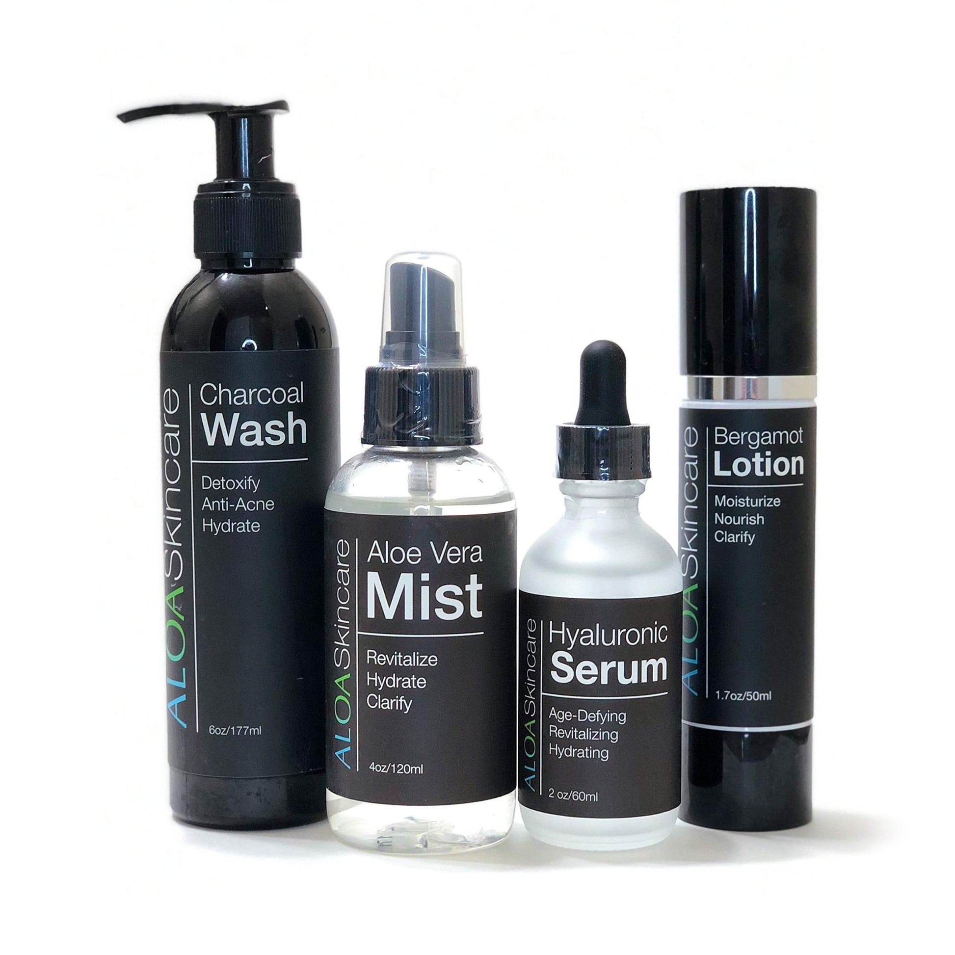 Details: ALOA Skincare's 4 step regimen is simple easy & effective! use it morning upon waking and evening 30 mins before bed. Clean Beauty was never this easy! Get the best of ALOA in one bundle : Activated Charcoal Wash, Aloe Vera Mist, Hyaluronic Acid Serum & Bergamot Lotion. All products are cruelty free, no parabens, non-GMO's, no artificial colors, non-toxic. Use ALOA Skincare products in your clean beauty regimen for clean and clear skin.