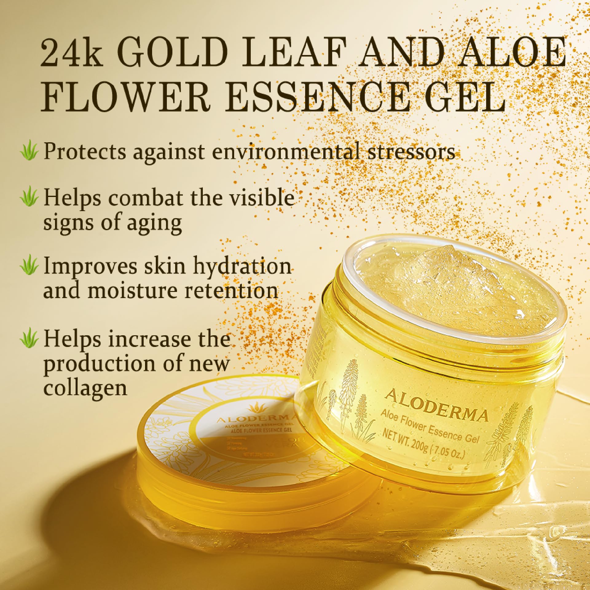 Aloderma Age-Defying Aloe Flower Essence Gel with 24K Gold Leaf, Made within 12 Hours of Harvest - Luxurious Aloe Gel with Allantoin & Hyaluronic Acid for a Shimmering, Youthful Complexion, 7oz 2-Pack