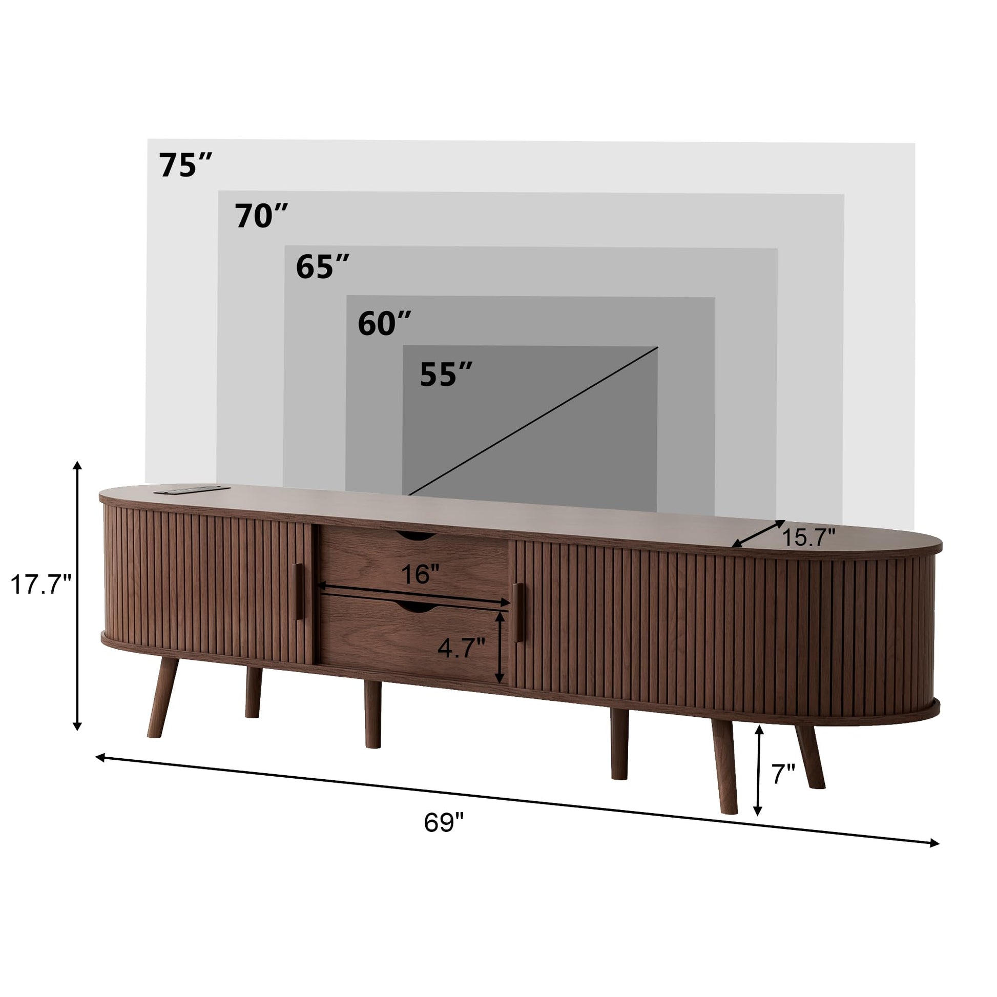 - 【Sleek Curve Round Edge】Walnut TV stand with outlets overall dimension: 69'(L) x 15.7'(D) x 17.7'(H). The smooth curved edges and simple line design is soften the look of the streamlined frame provide an environment safe for kids and family. Adding modernity and comfort to your living room. Mid-century modern media consoles with sliding slatted doors design, drawers, and adjustable shelves.