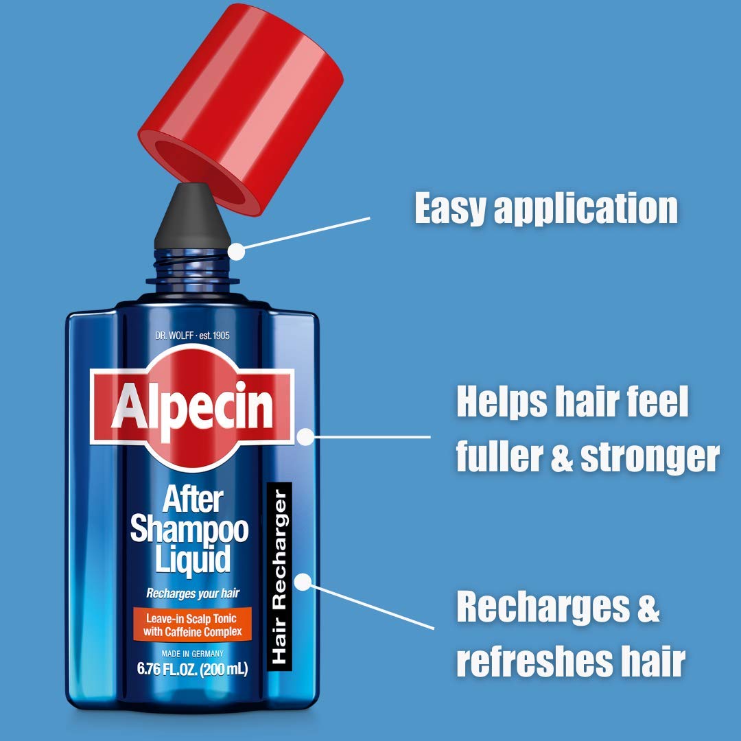 - Provides nourishment to thinning hair |Recharges and refreshes hair|Easy application|Suitable for all hair types|After washing with the Caffeine Shampoo use the Alpecin After Shampoo Liquid dosage tip to apply directly on the scalp|Part hair and massage in do not rinse out|Let dry briefly for about 3 minutes|Style as usual with your favorite wax or pomade