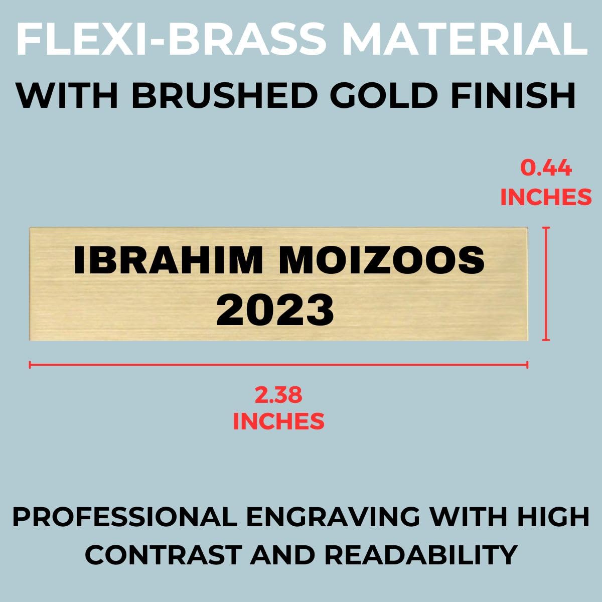 - ✅PREMIUM MATERIAL: Made of durable flexi-brass with a brushed gold finish for the best high contrast presentation and readability when engraved. Each name plate measures 2.38 inches wide and 0.44 inches tall.