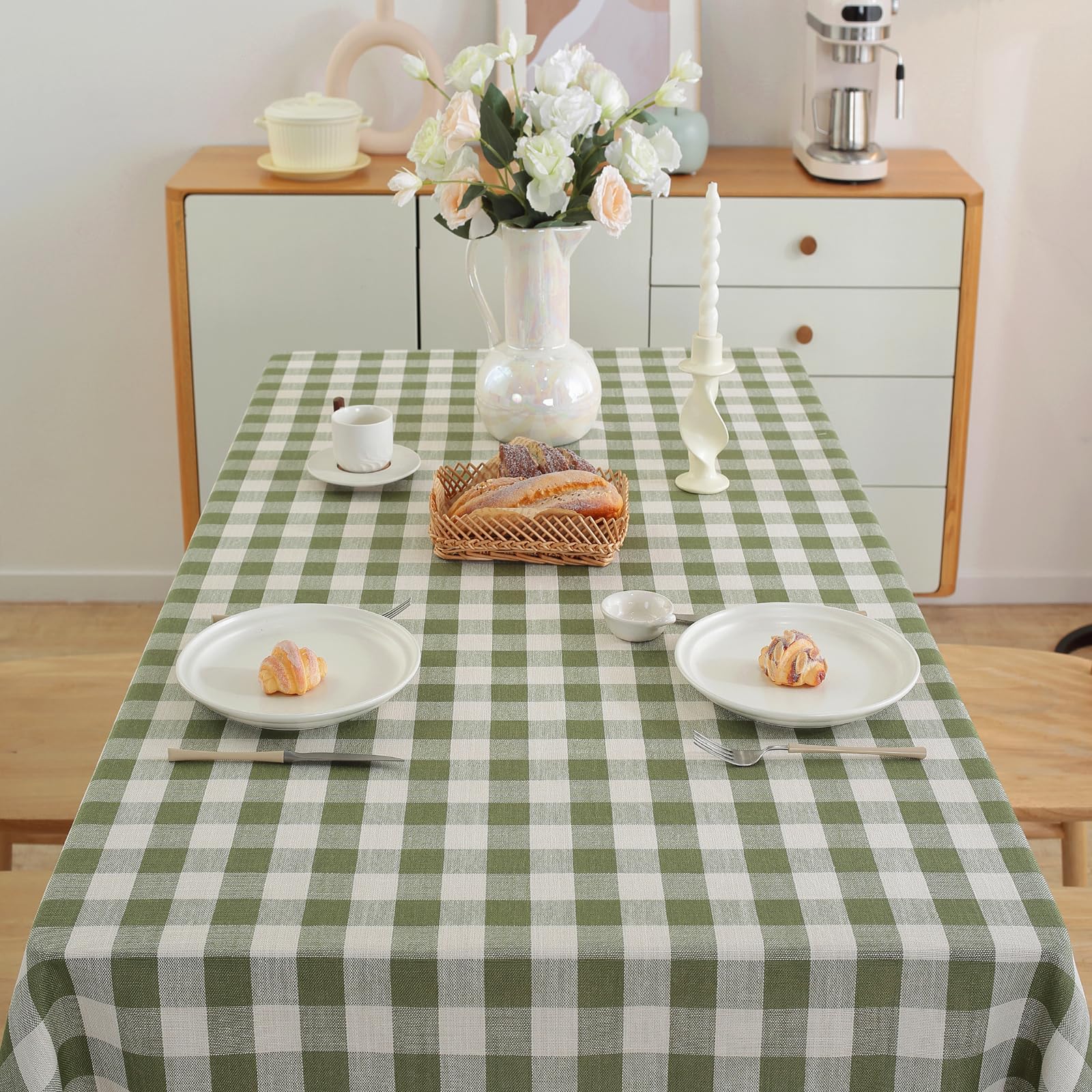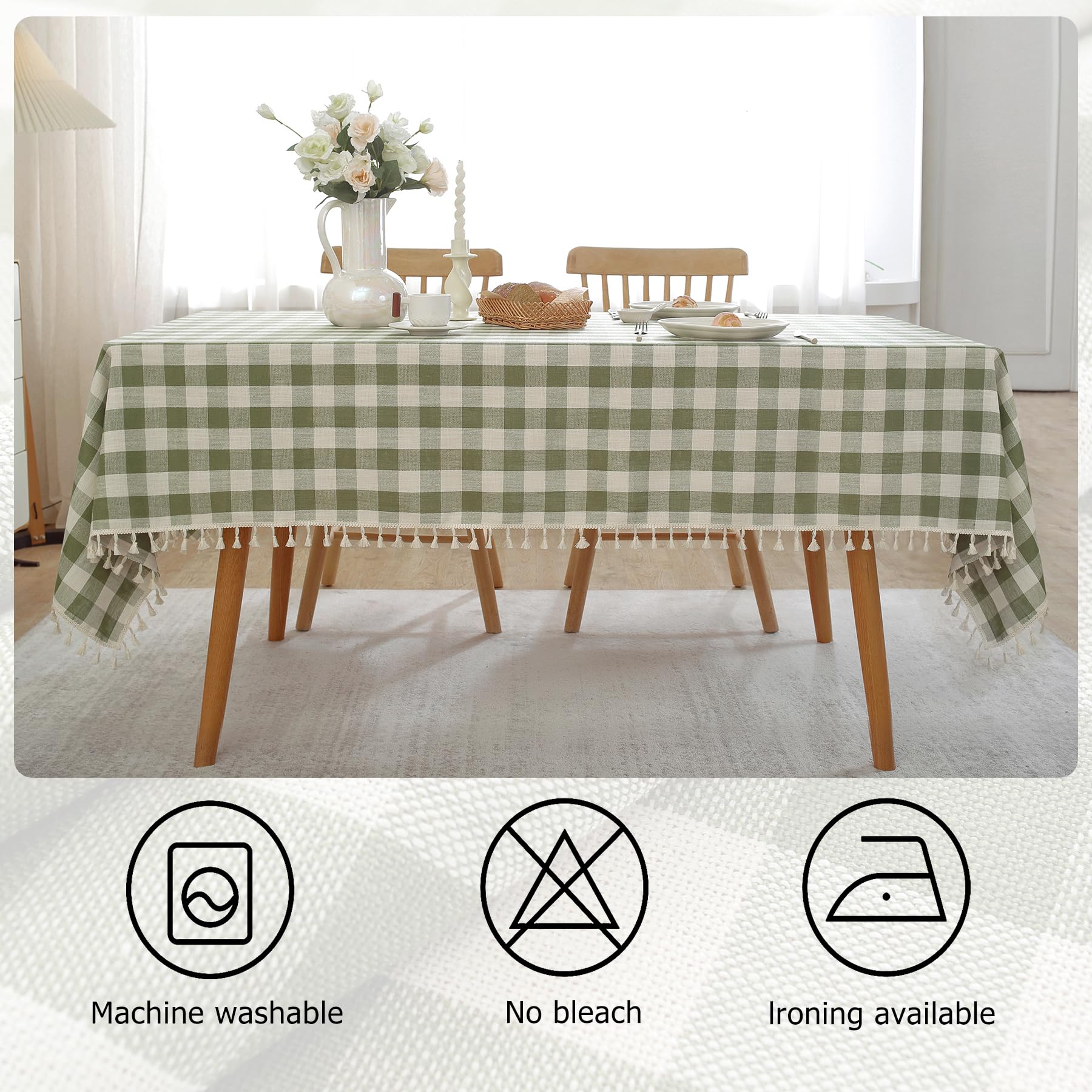 Alsoo Checkered Rectangle Tablecloth Cotton Linen Fabric Gingham Table Cloth Buffalo Plaid Table Cover with Tassel Wrinkle Free Washable for Kitchen Dining Picnic, Green and White, 55X75''
