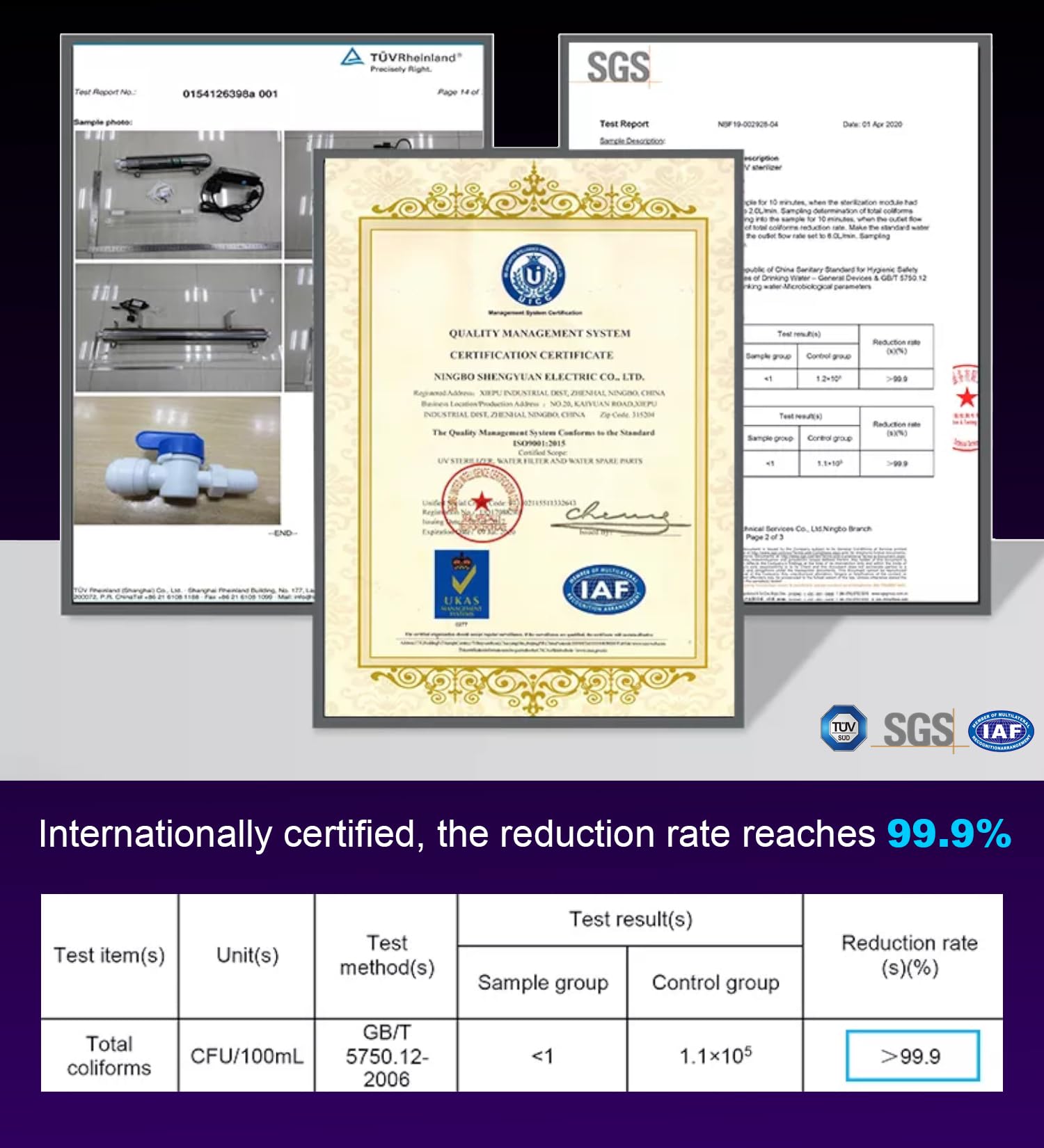 • Ballast with intelligent flow sensor: upgraded 110V-240V 48W ballast with intelligent flow sensor, automatic control and monitoring system performance. The Display panels shows the counter down timer, If there is no water flowing through it, counting down from 600s to Os, Once the number reaches 0, the UV͎ lamp will be off automatically. The Number will show 600s again if there is water flow passing the UV͎ chamber. Energy saving, prolonging the service life of the system, and preventing the system from overheating.