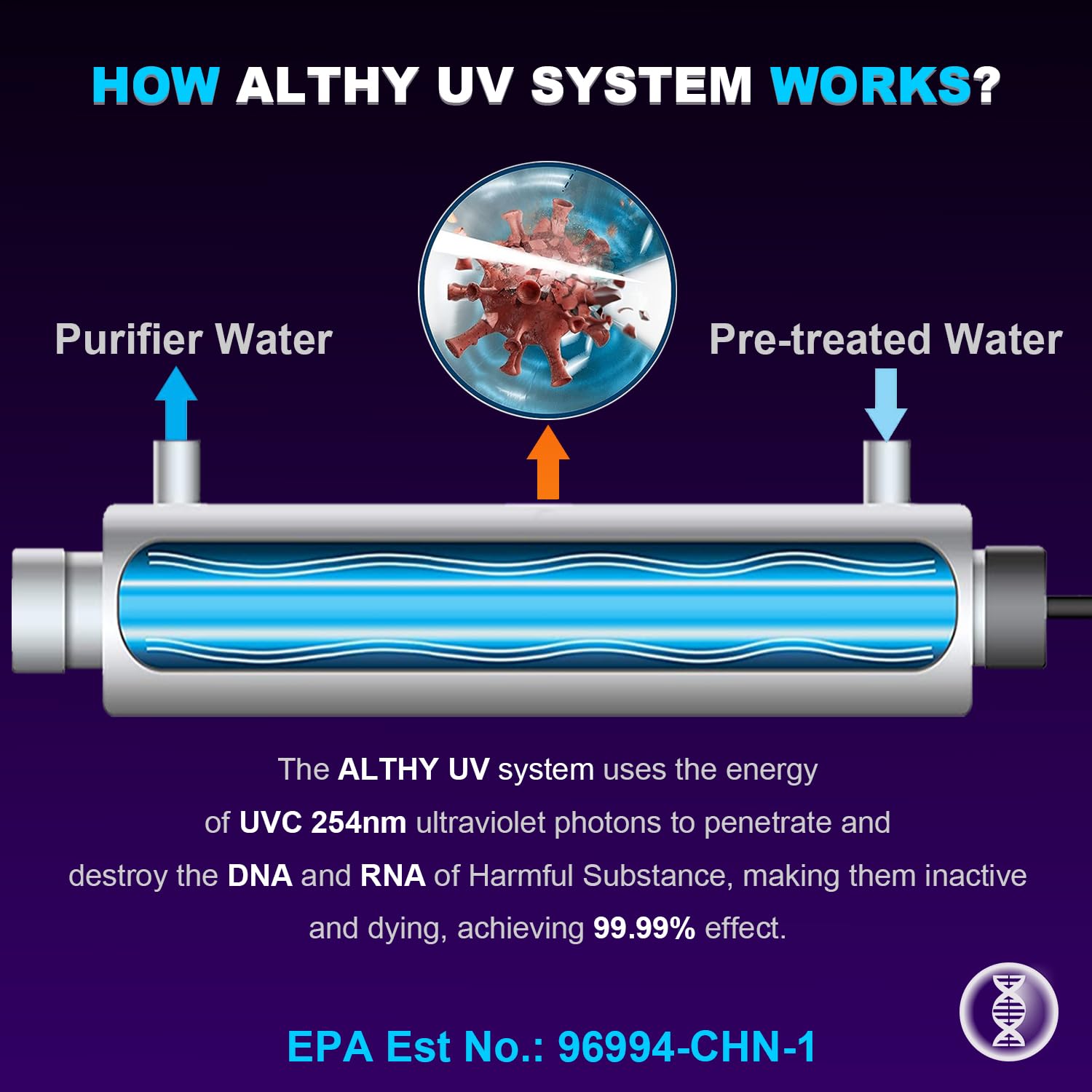 • Whole-house water treatment: As an upgraded version, ALTHY UV͎F-FS48 is the perfect step to add to your whole-house water filtration system, ALTHY powerful UV͎-C technology , allowing you to enjoy all the water in your home with peace of mind.