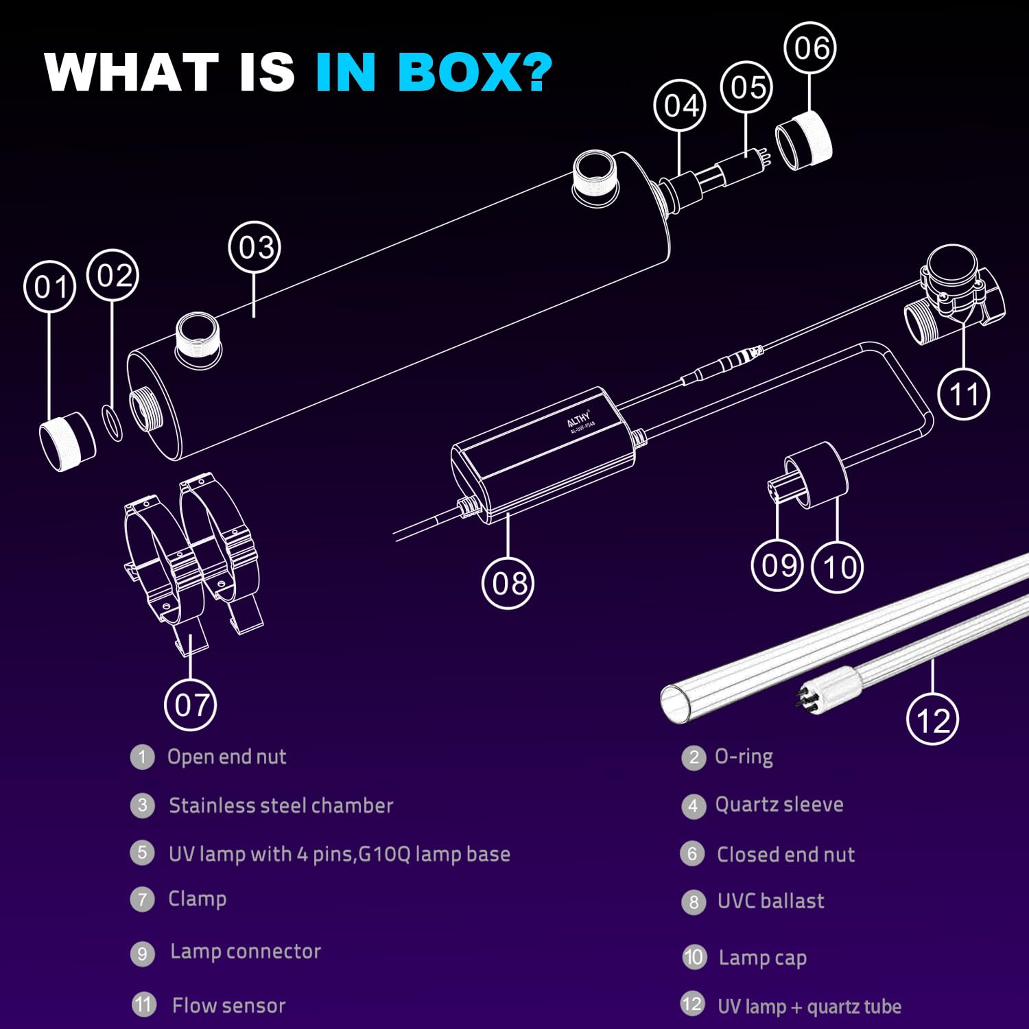 • Premium Safe Materials: 1-inch MNPT inlet/outlet design for 12 GPM flow and minimal pressure loss; Premium 48-watt UV͎C lamp with durable quartz sleeve, bulb life up to 9,000 hours, ensuring water in 304 Stainless steel The long residence time in the reaction chamber enables efficient processing;