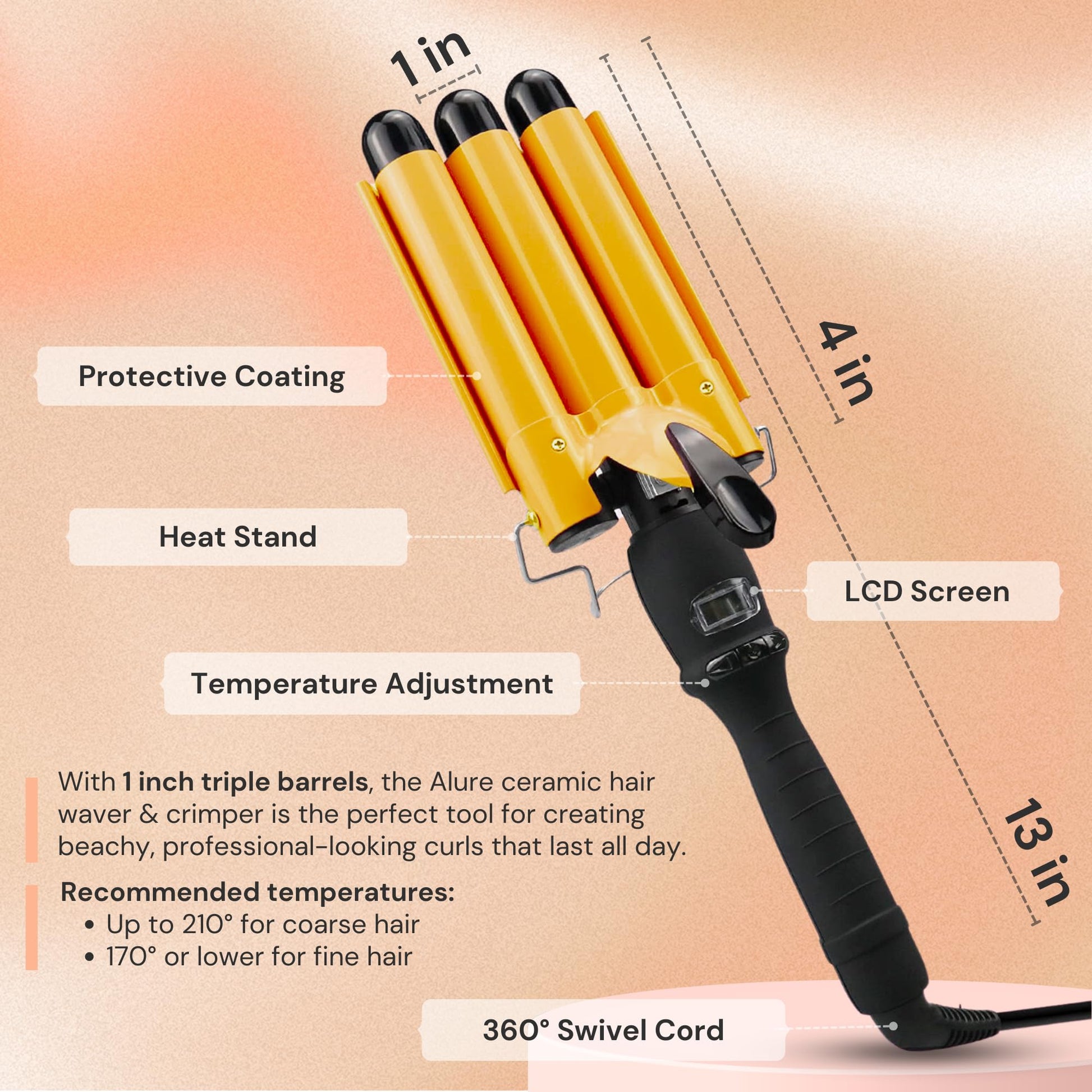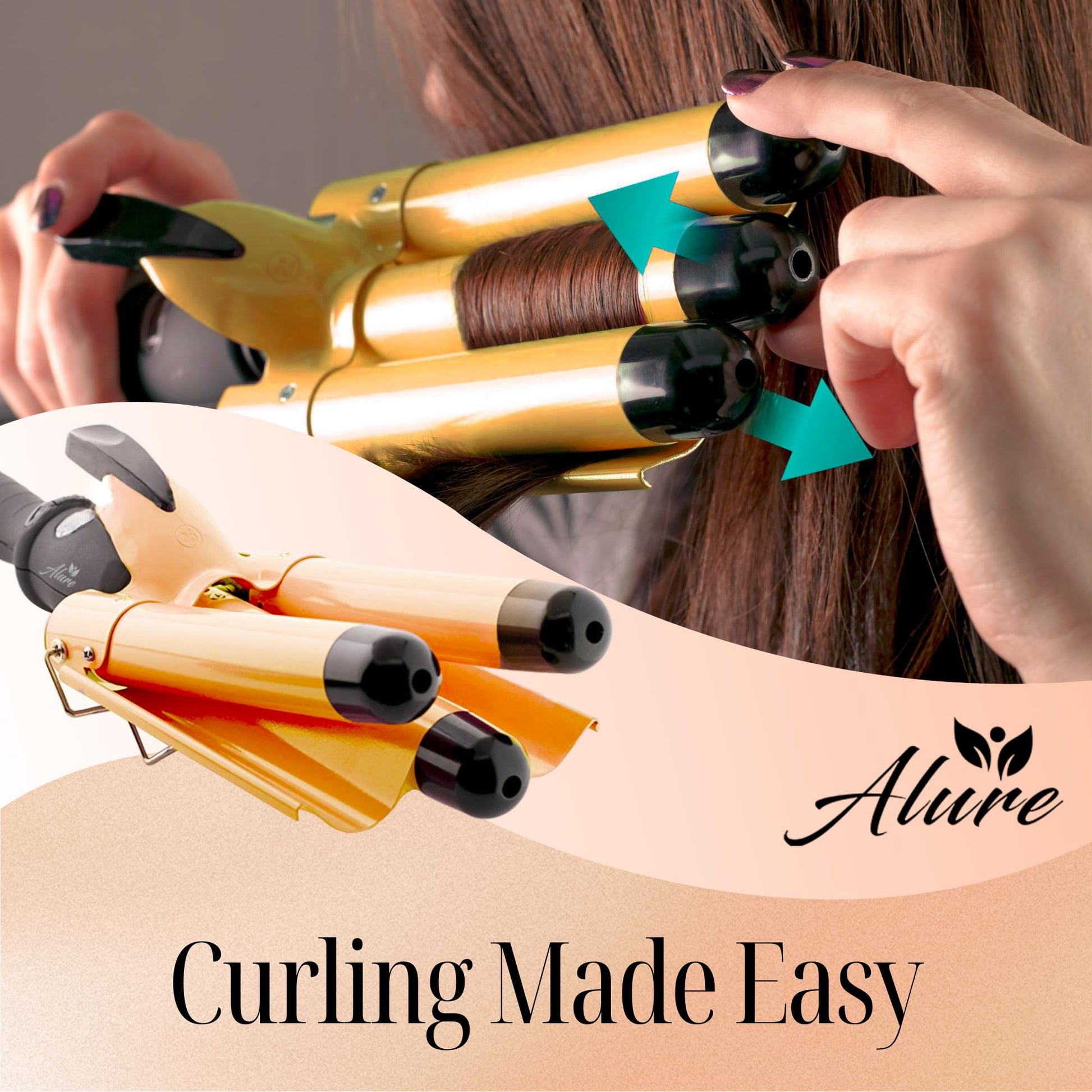 Alure Three Barrel Curling Iron Wand Hair Waver with LCD Temperature Display - 1 Inch Ceramic Tourmaline Triple Barrels, Dual Voltage Crimp (zGold)